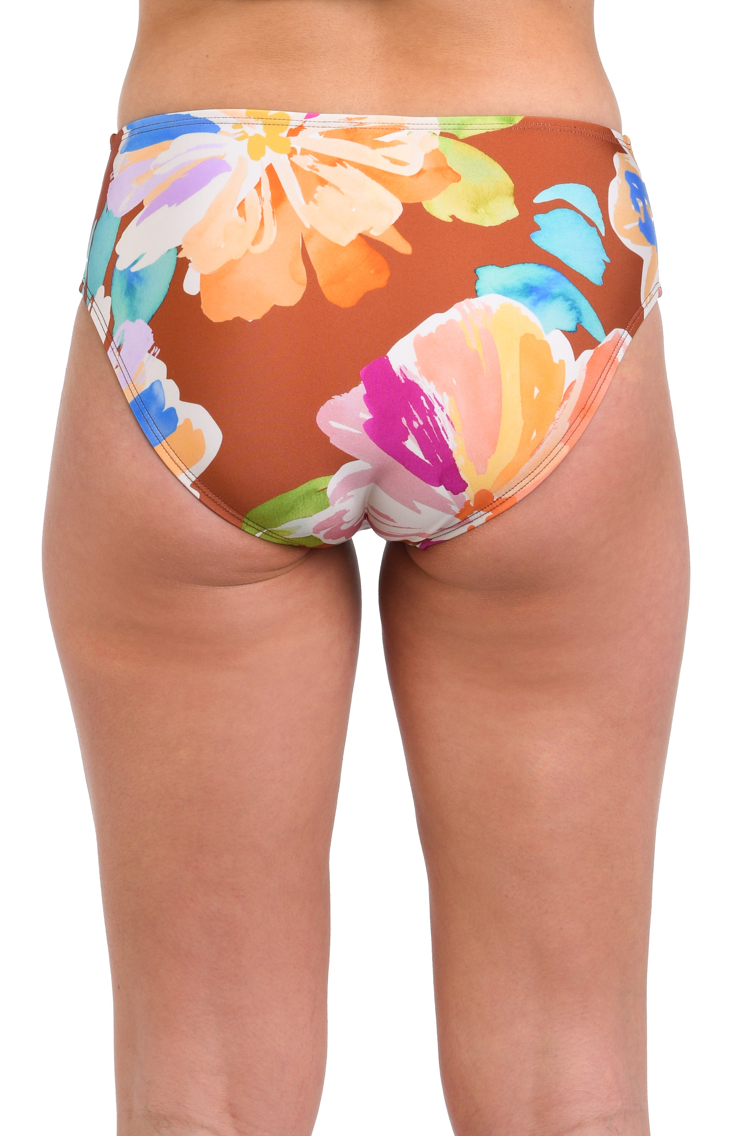 This vibrant print features an abstract floral watercolor design. Its bold strokes and sweeping shapes give it a lively, summery feel perfect for any swim occasion. This mid rise bottom boasts a contemporary design, offering a chic and on-trend choice.