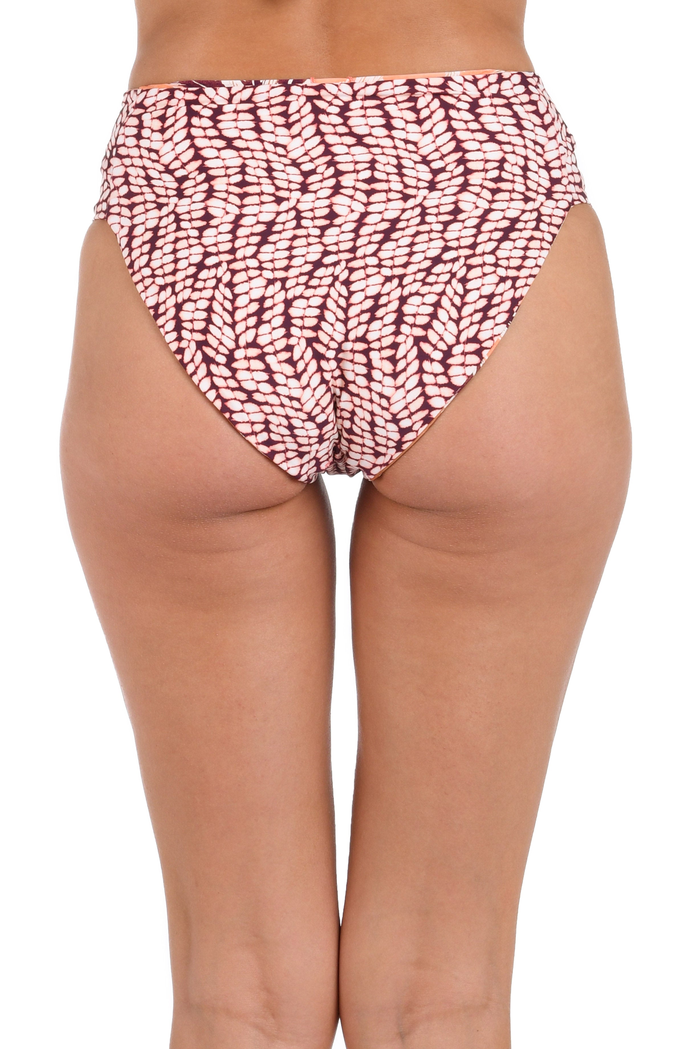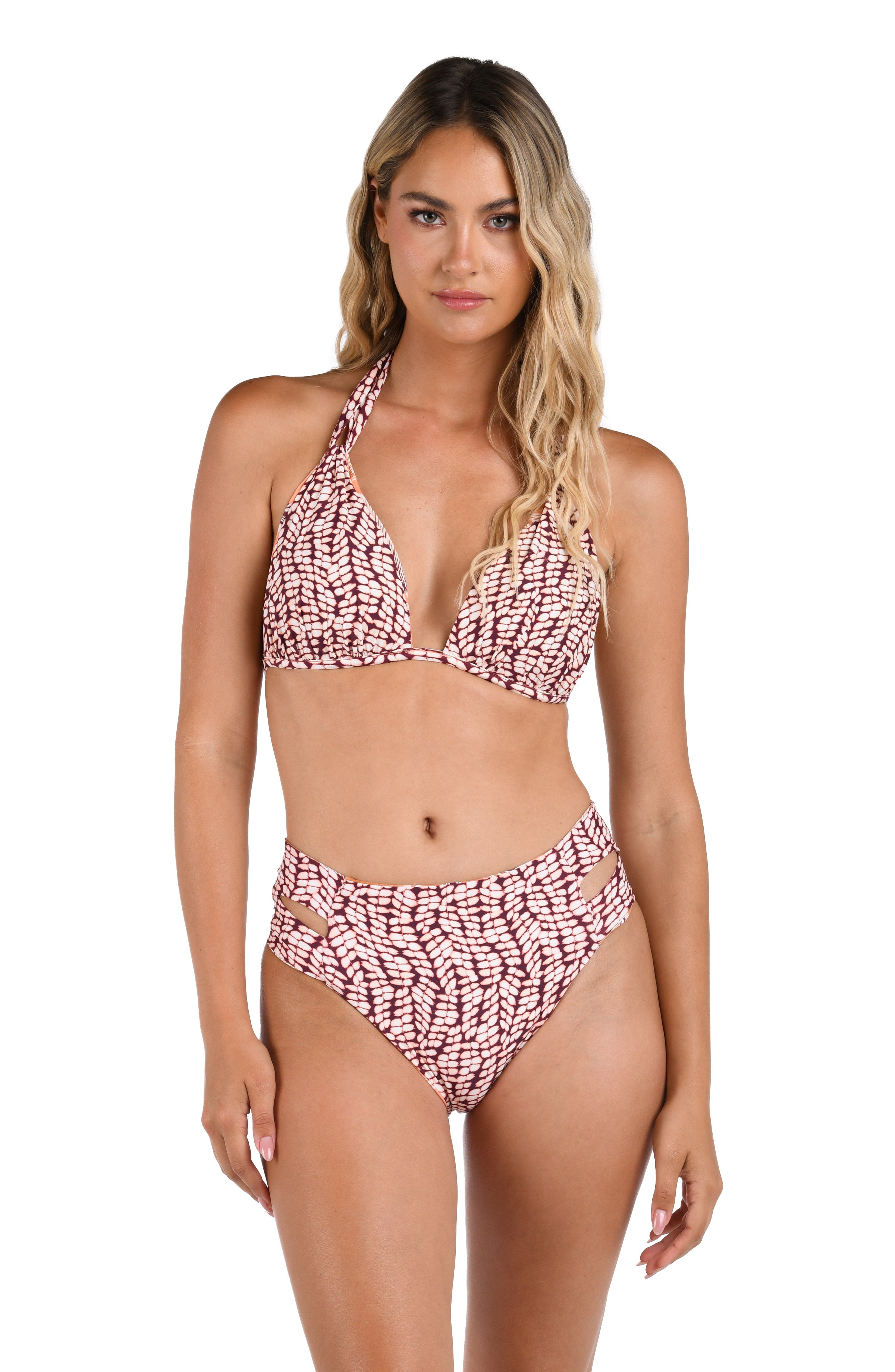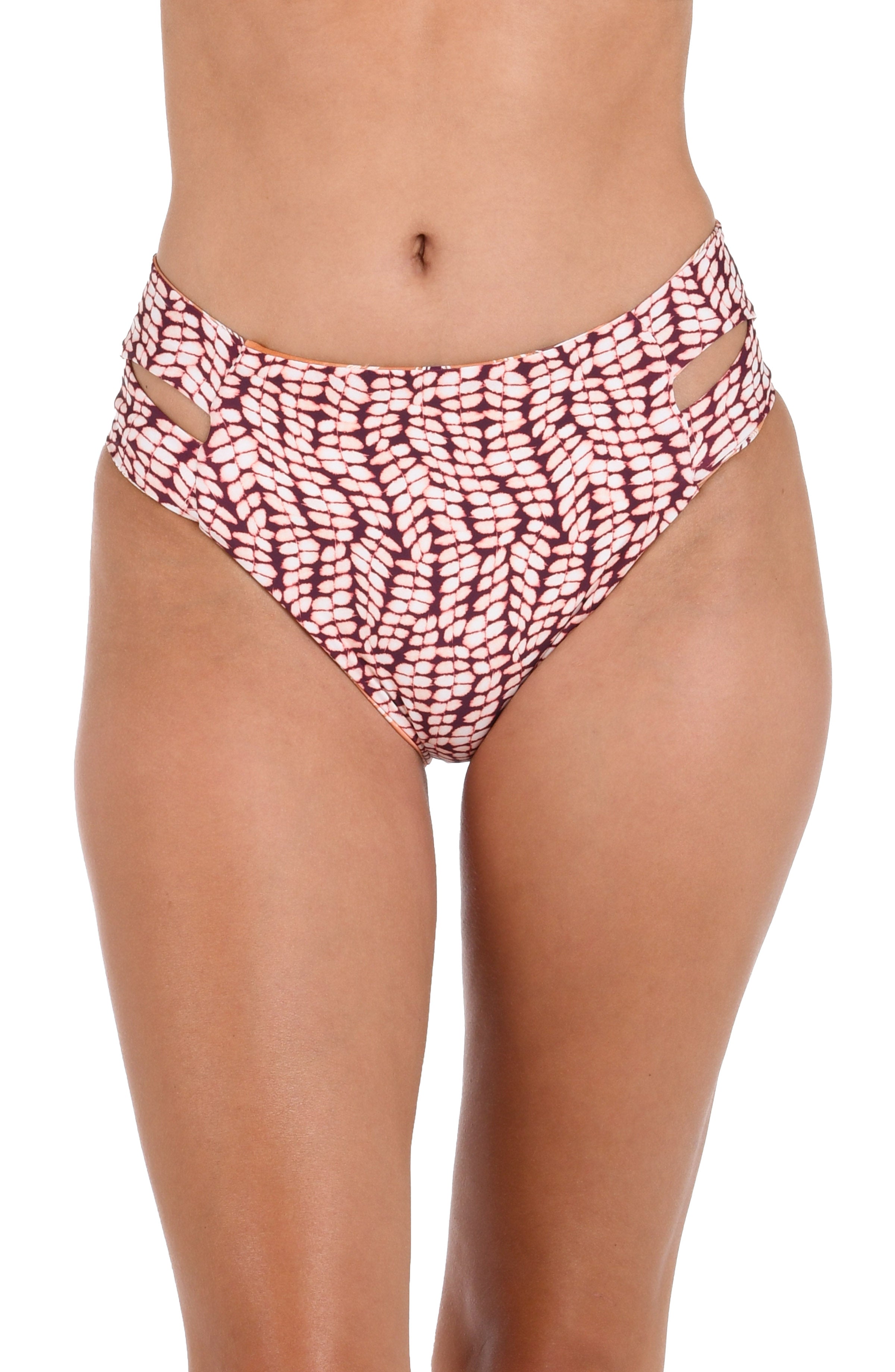 This print features a warm, earthy-toned background with a mix of sienna shades, overlaid with delicate leaf patterns in muted browns. The unique side cut-outs add a modern twist. Moderate rear coverage ensures comfort and style.
