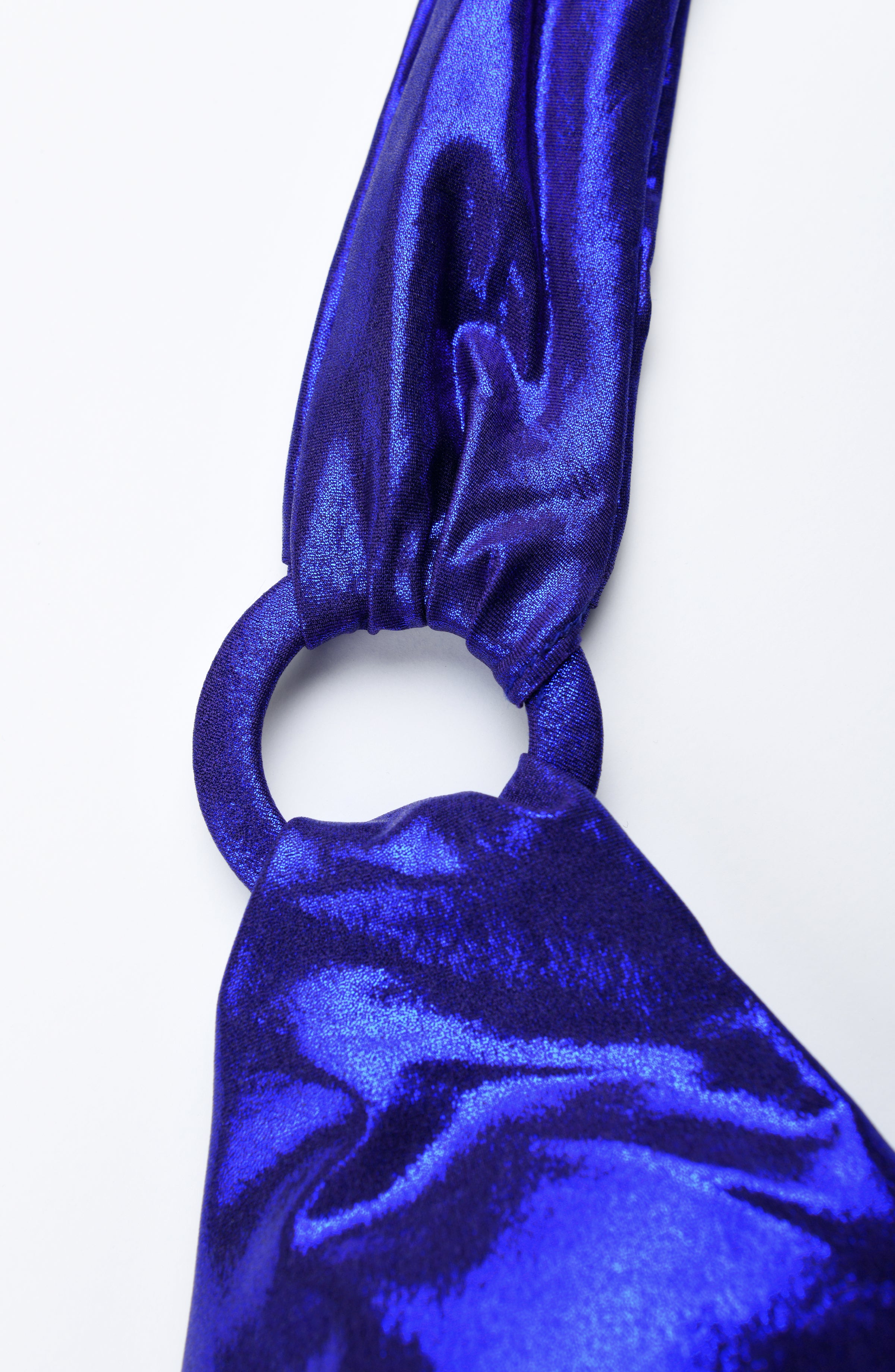 Reflecting the sparkle of the sea, this top features a deep, vibrant ultramarine with a high-shine finish for a luxurious and eye-catching look. With a triangle slider silhouette that adds a sophisticated refresh with a plunging V-neck and round strap rings. The halter-style straps loop around the neck and tie for a unique finishing touch.