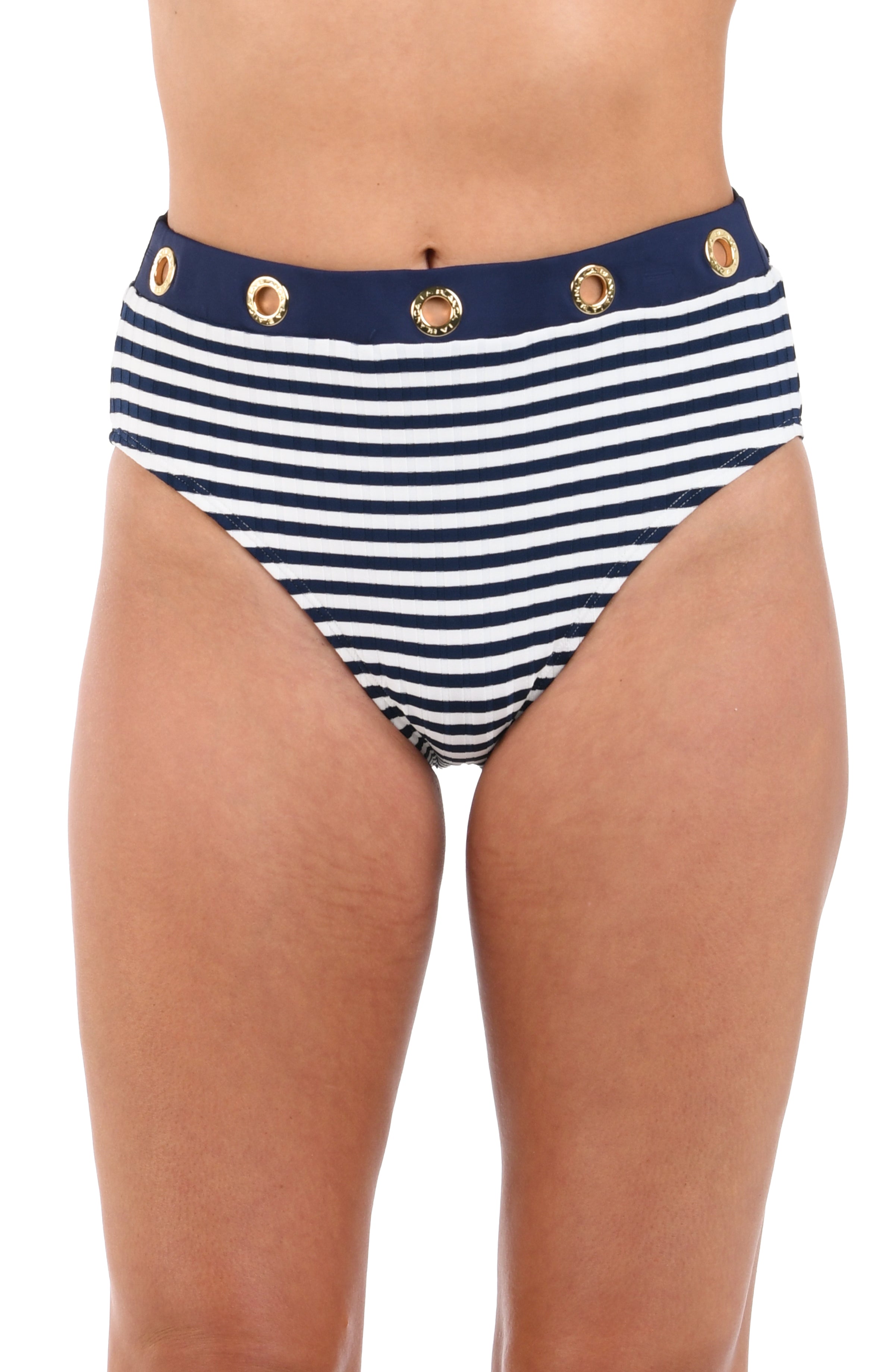 This classic knit rib gets a stylish update with grommet detailing, perfectly complementing the timeless navy and white stripes that evoke a nautical and elegant charm. The iconic high-waist design has a glamourous retro-inspired vibe that lets you show off your curves with confidence. Built-in tummy control instantly trims and tones, while moderate coverage in back ensures these bottoms stay firmly in place.