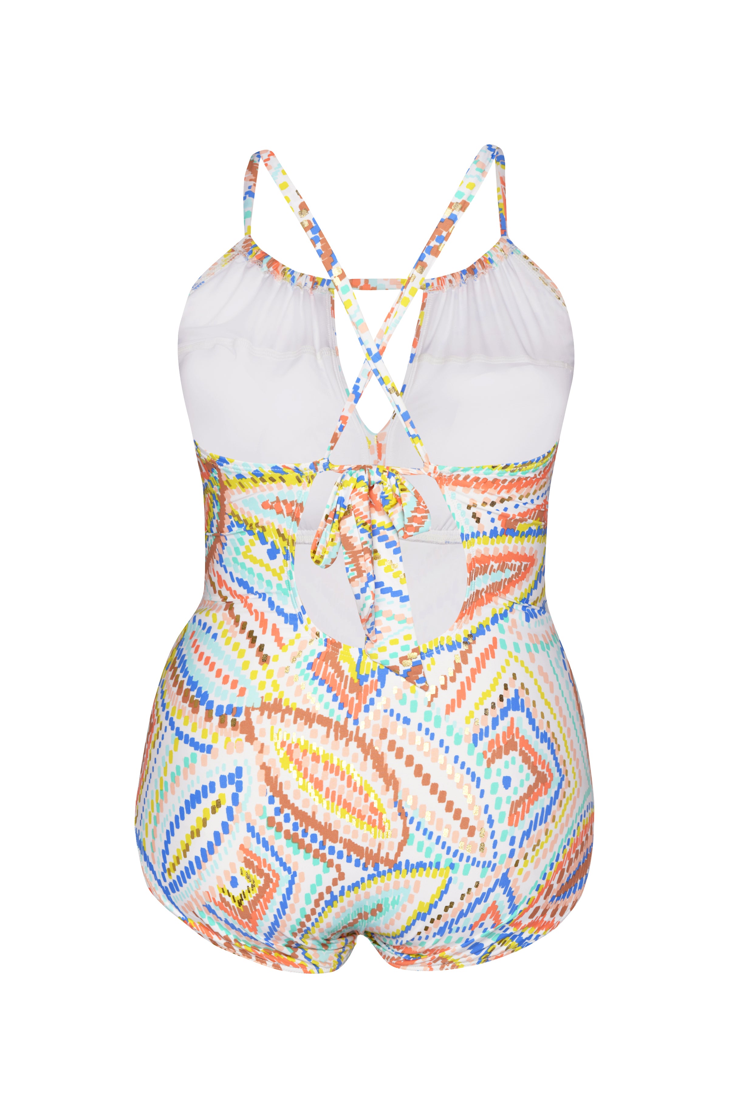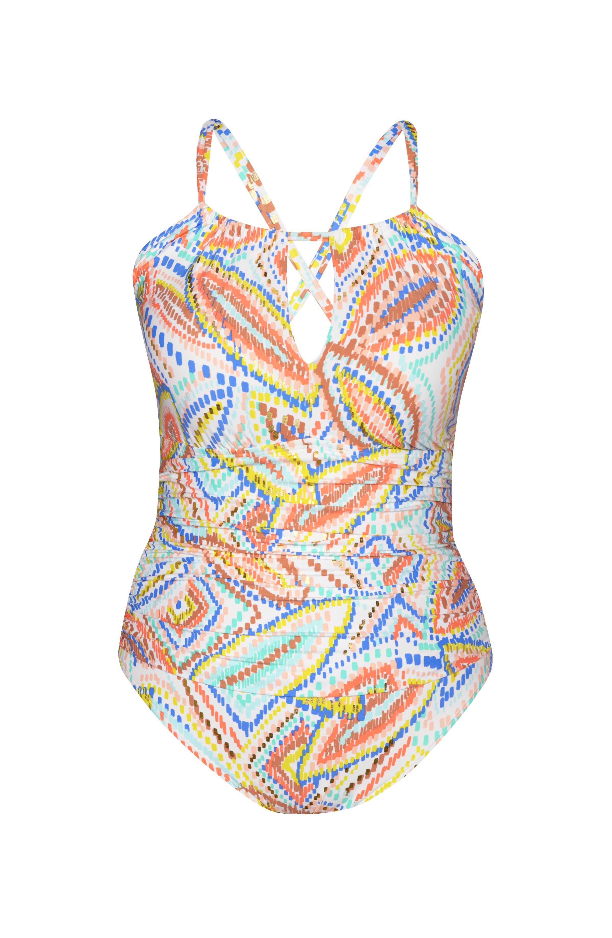 This playful print features a geometric pattern in pastel shades of pink, blue, and yellow, accented with sporadic glimmers of gold foil details, adding a modern twist to classic swimwear. The high-neck keyhole neckline lets you reveal as much (or as little) skin as you like. A shaping fit flatters the figure and moderate coverage in back gives you an added boost of confidence.
