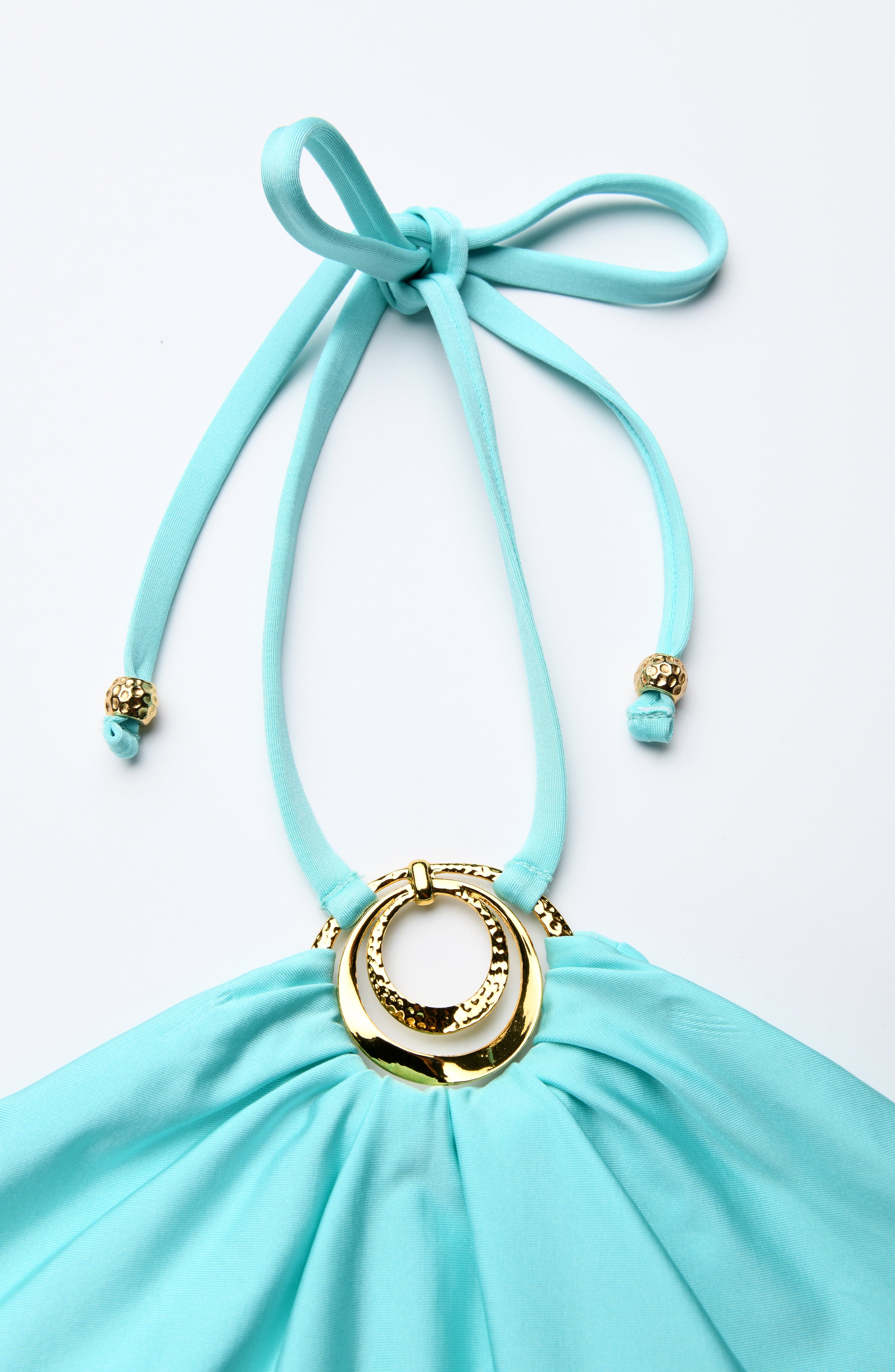 Reflecting the translucent quality of beach glass, this greenish-blue hue captures coastal calm, pairing well with various shades for a beach-inspired look. The high neck design on this shaping one piece cuts a flattering silhouette, bringing balance to your shoulders while slimming your arms. Adjustable straps that tie around the neck attach with a luxe gold ring. A high-cut front lengthens the legs, while moderate coverage in back keeps you confident.