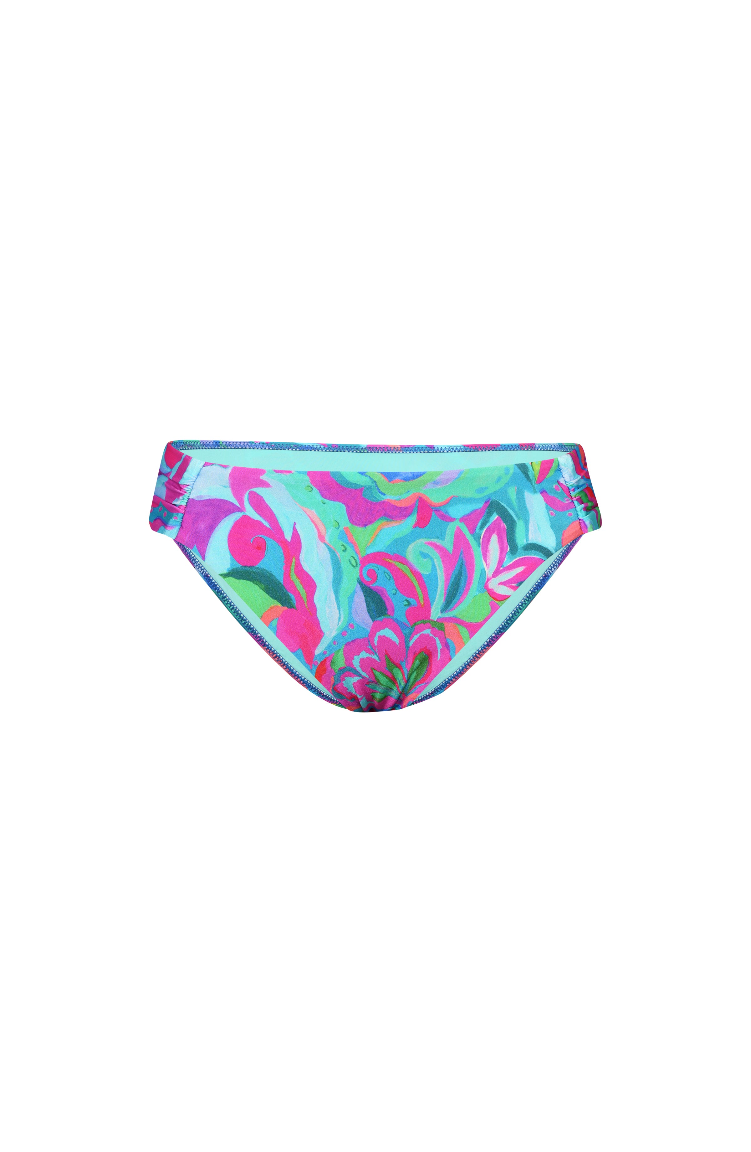 Get ready to make a splash with a vibrant, swirling pattern of abstract floral shapes, showcasing bold, saturated hues of turquoise, pink, and violet. A hipster silhouette with hip-flattering shirring on each side offers just-right coverage to keep the look sophisticatedly seductive.