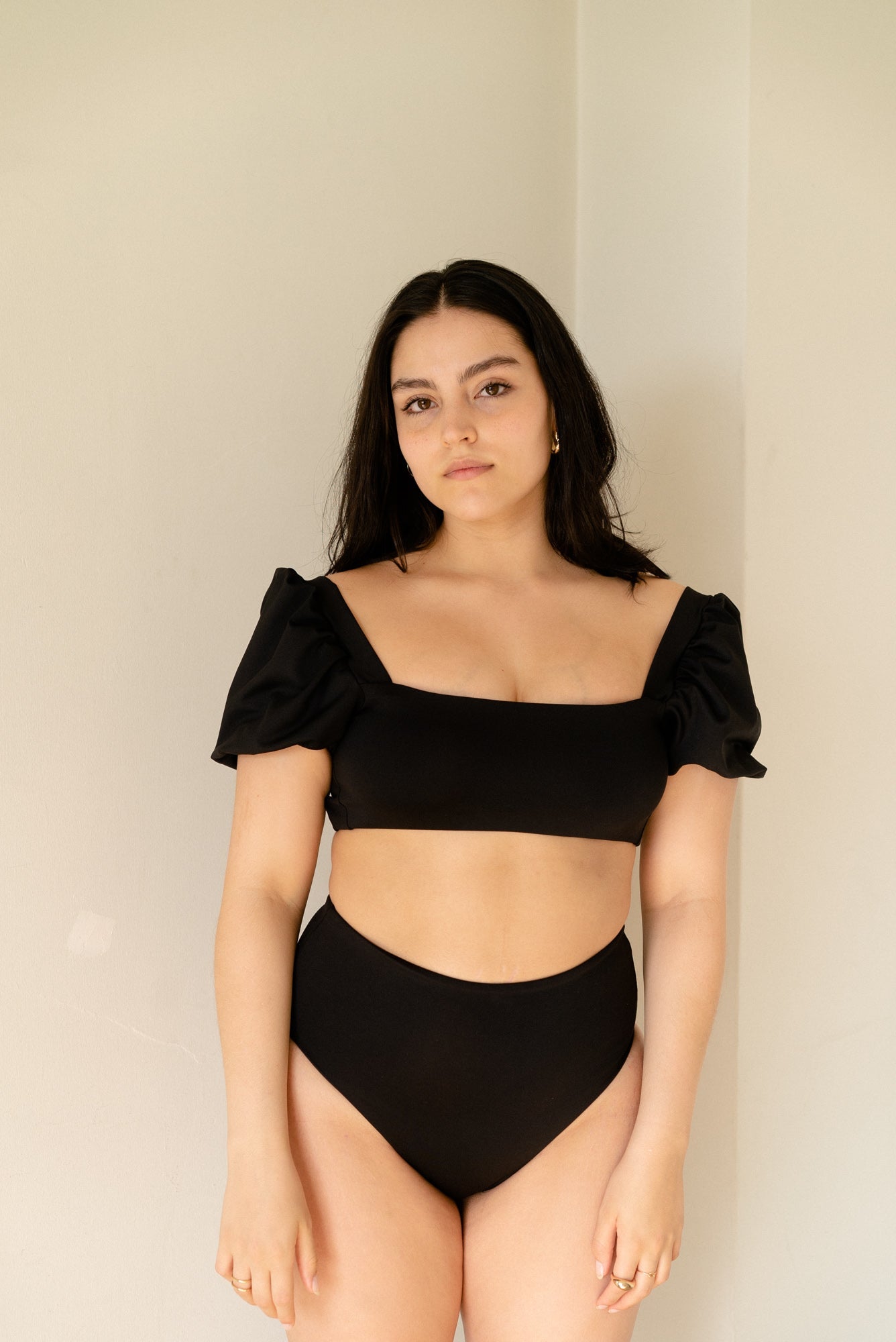 This top can be worn forwards or backwards for maximum versatility. Voluminous puff sleeve with adjustable tie. The square neckline in the front is best for those looking to maximize support.