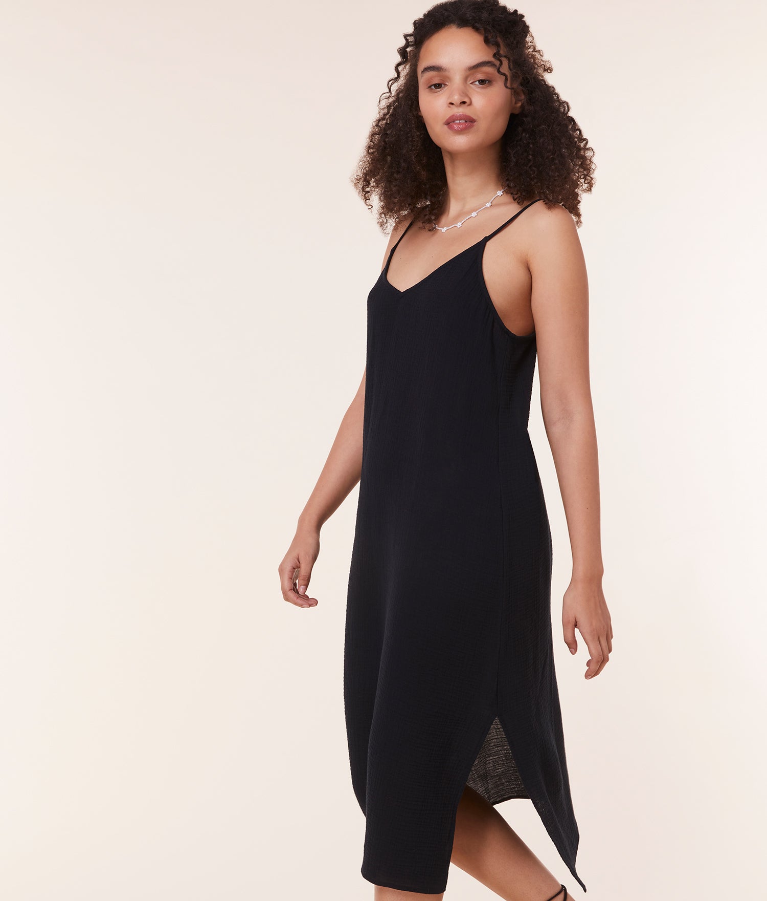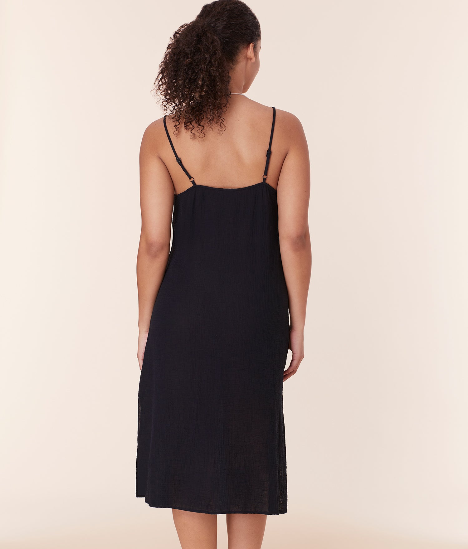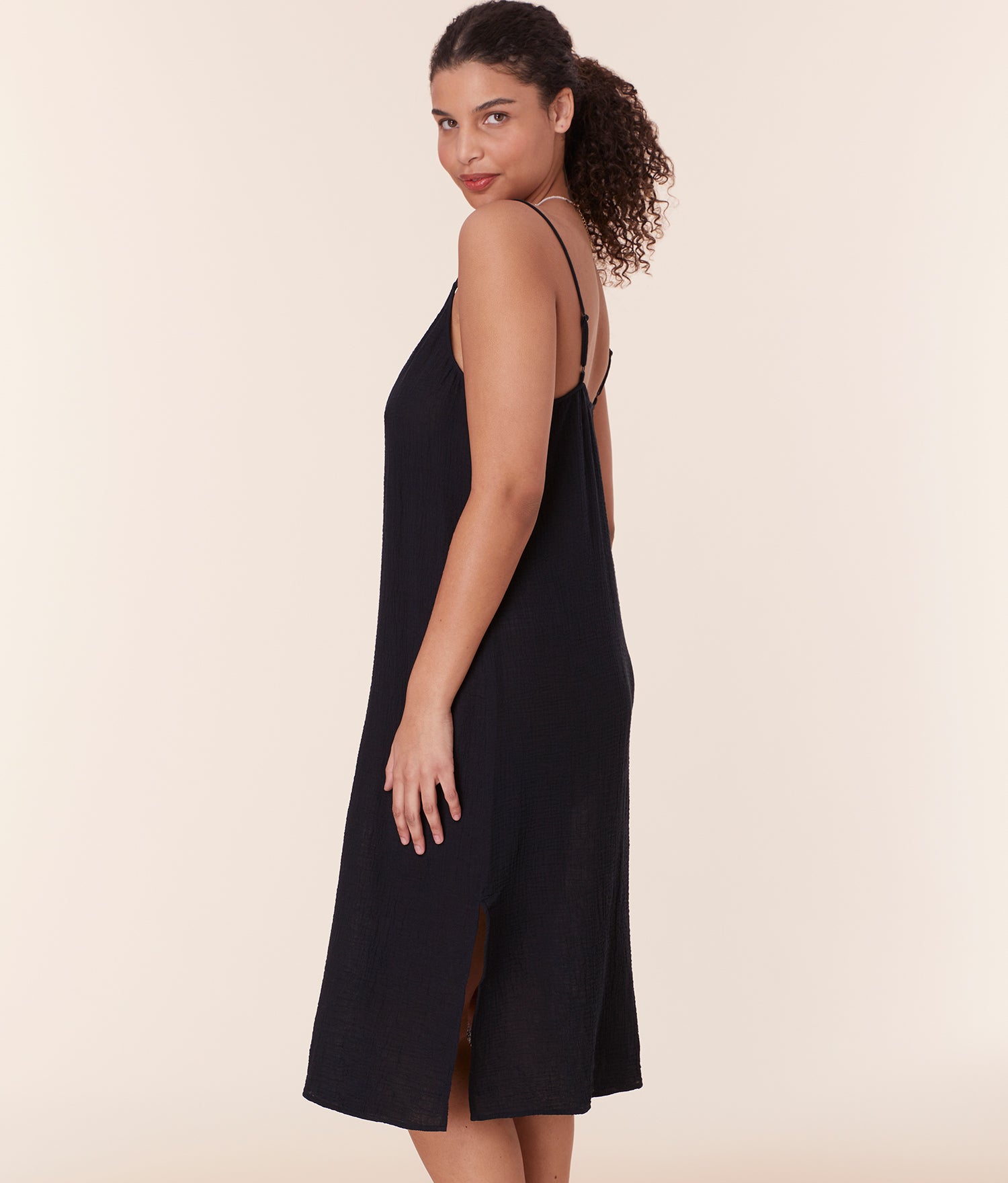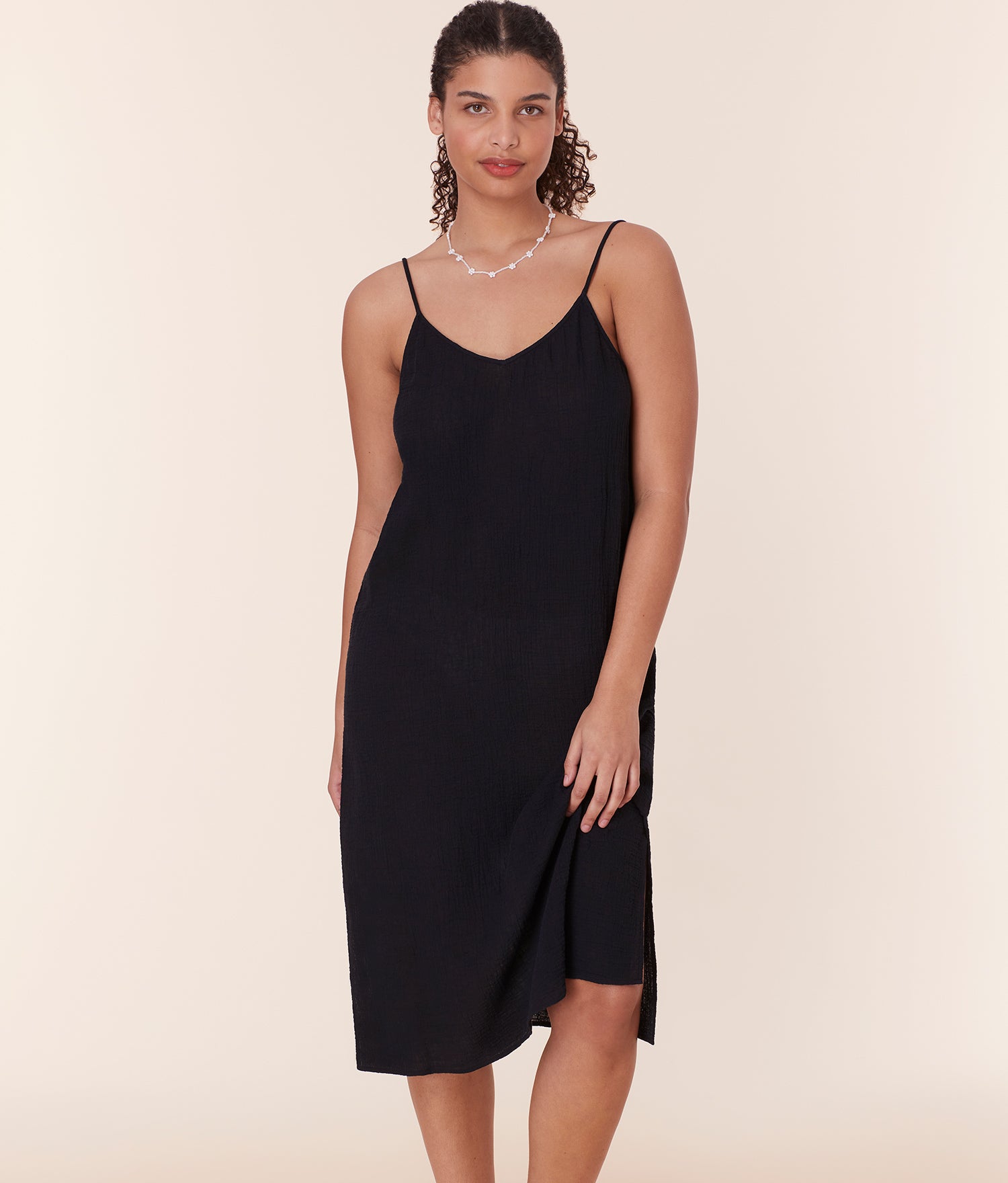 The Barreta Dress is the cover-up you’ve been missing. With adjustable straps, a V-neck, and side slit, this dainty slip dress can easily be worn out to dinner.