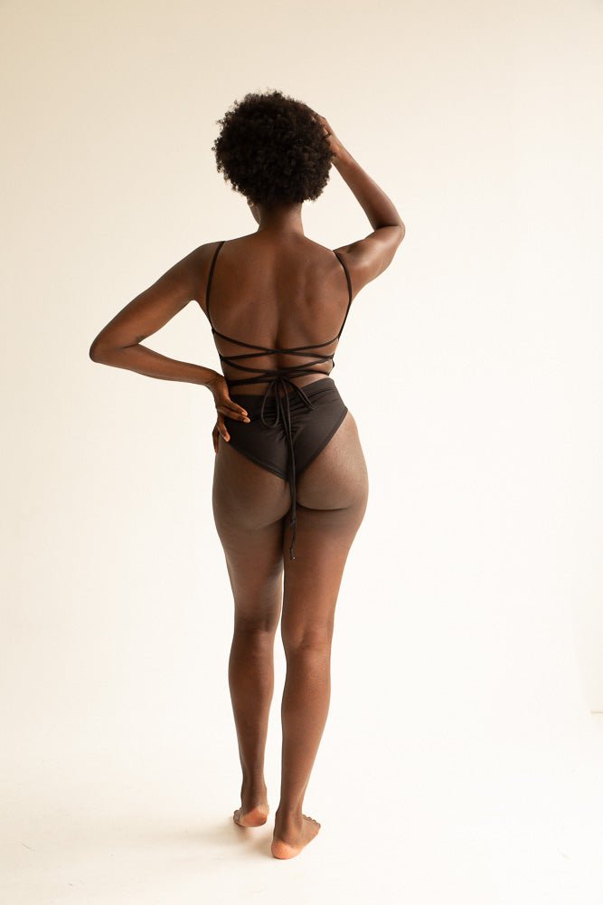 Made from 6 recycled plastic bottles, this one piece features a classic front-fit with a scooped neckline and moderate coverage on the side of the bust. The adjustable straps wrap around the back and lace up in a corset design and tie up in a perfect bow. All finished with our signature cheeky scrunch bottom (of course).