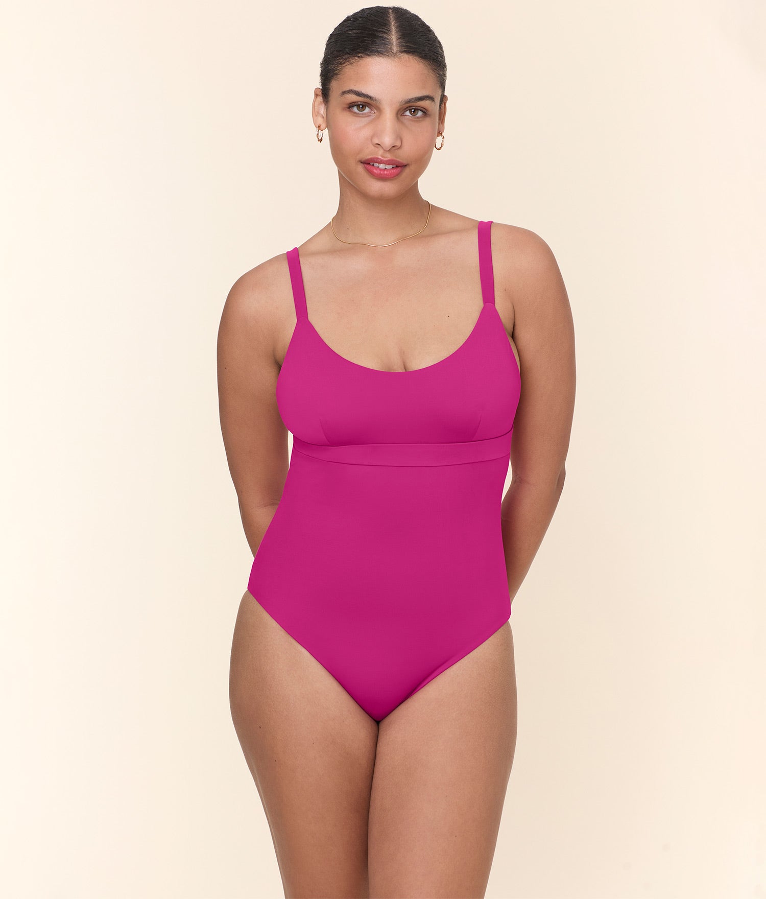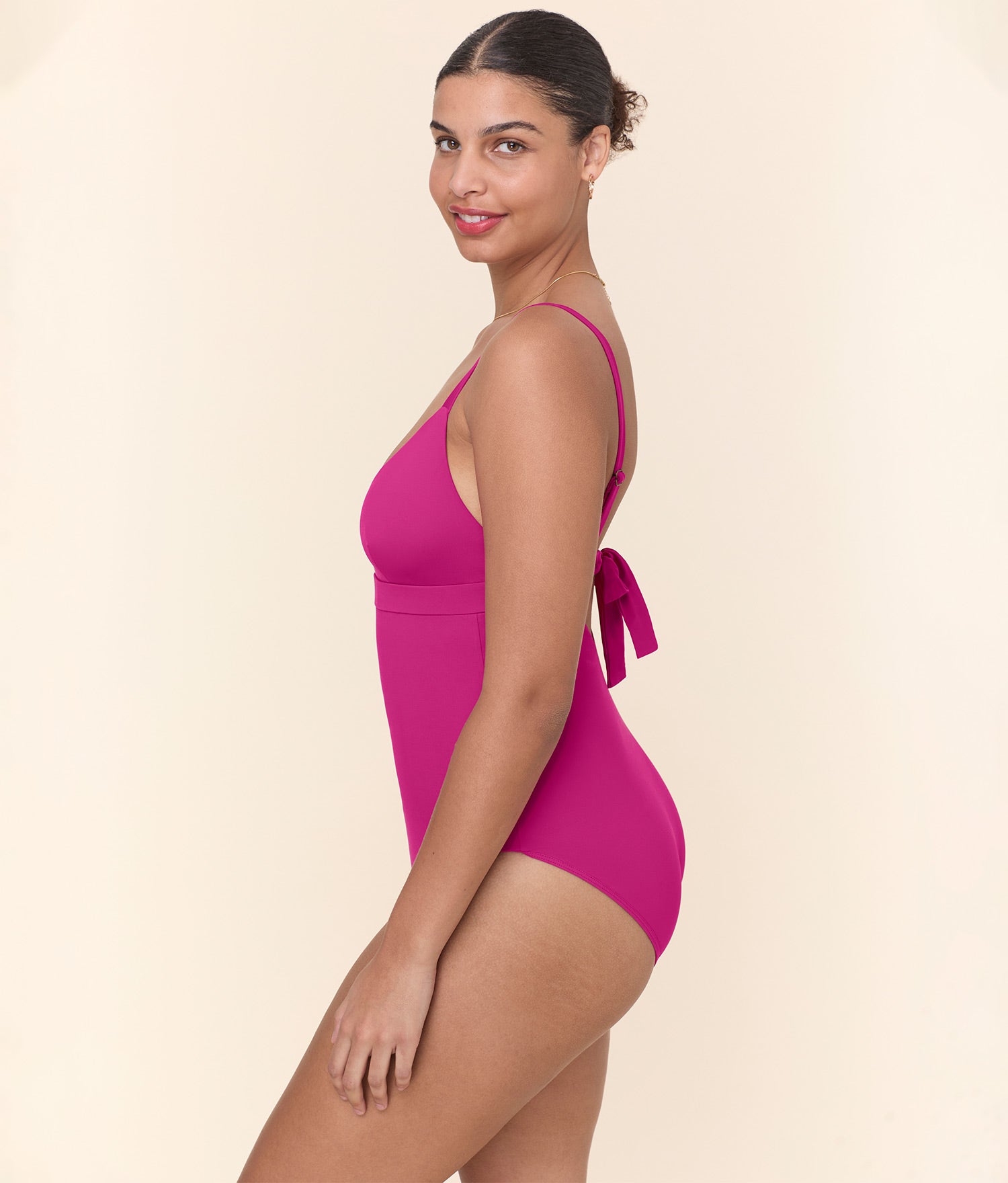 Simply stunning, this timeless, v-neck one piece sports adjustable straps and a versatile tie back for the perfect fit.
