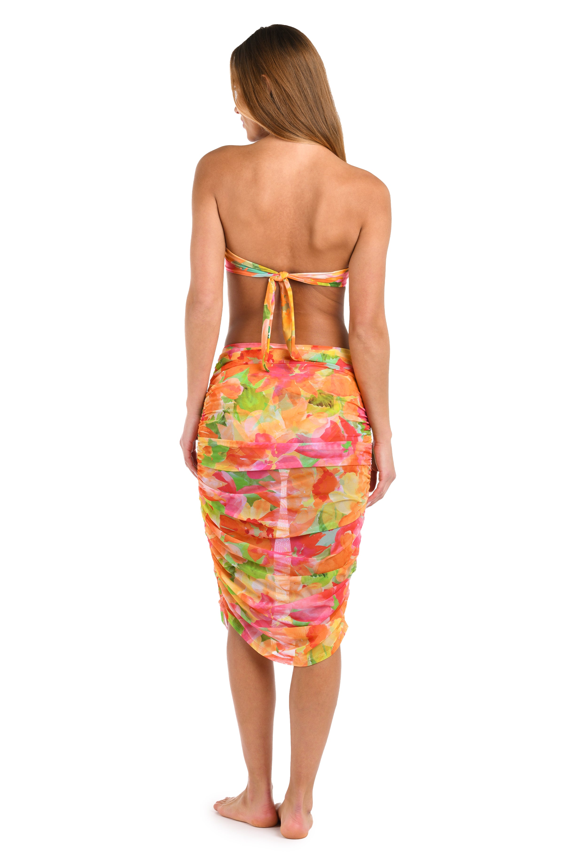 This print features an intricate, ornate design with a mix of pastel hues, including soft yellows, pinks, blues, and greens, creating a dreamy, ethereal effect. This mesh cover-up skirt features a shirred design with a fitted silhouette, offering a flattering and elegant look. The lightweight, sheer fabric ensures breathability and comfort, making it perfect for layering over swimwear.
