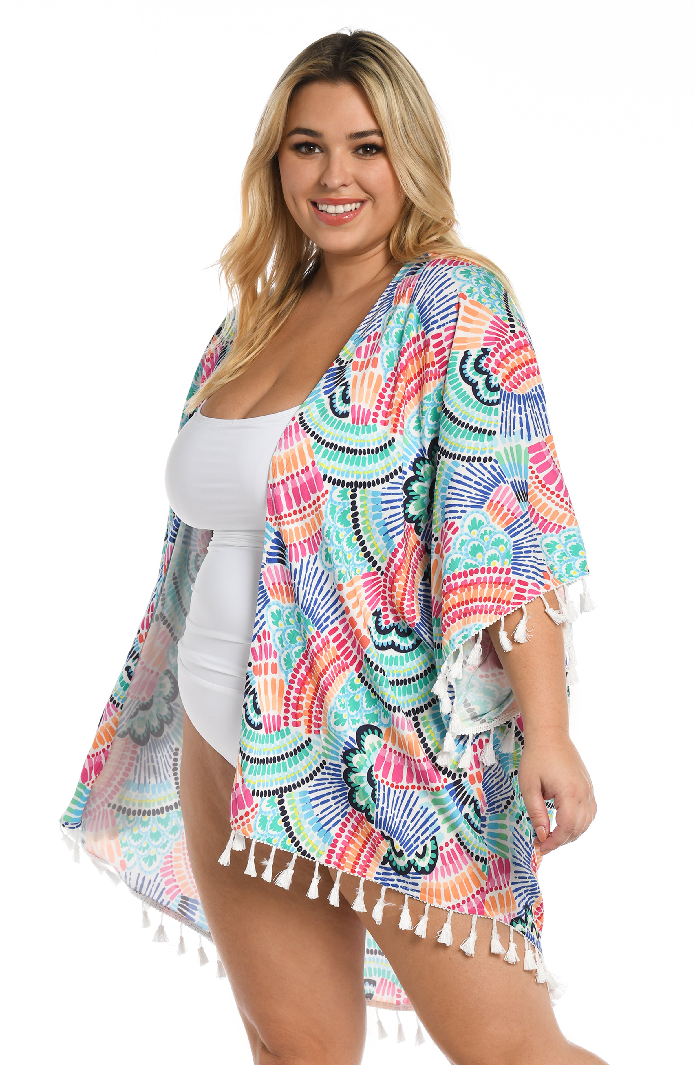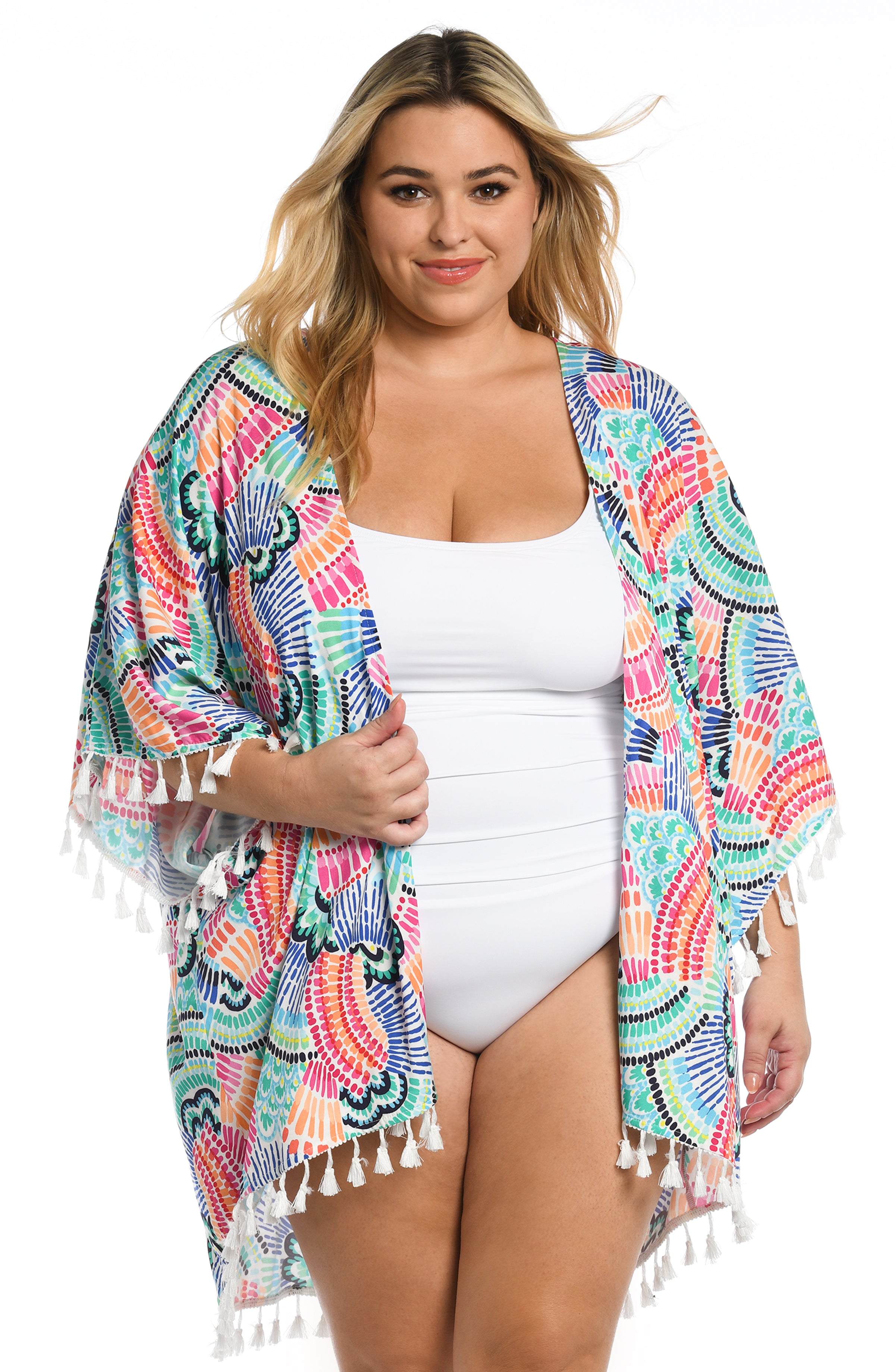 Make some waves in this gorgeous kimono. It has a breezy, square cut design, a carefree open front and playful tassels along the sleeve openings and hem. While it's the perfect piece to pair with your suit, this chic cover-up also makes a stylish statement when layered with a casual outfit for ship-to-shore ease.