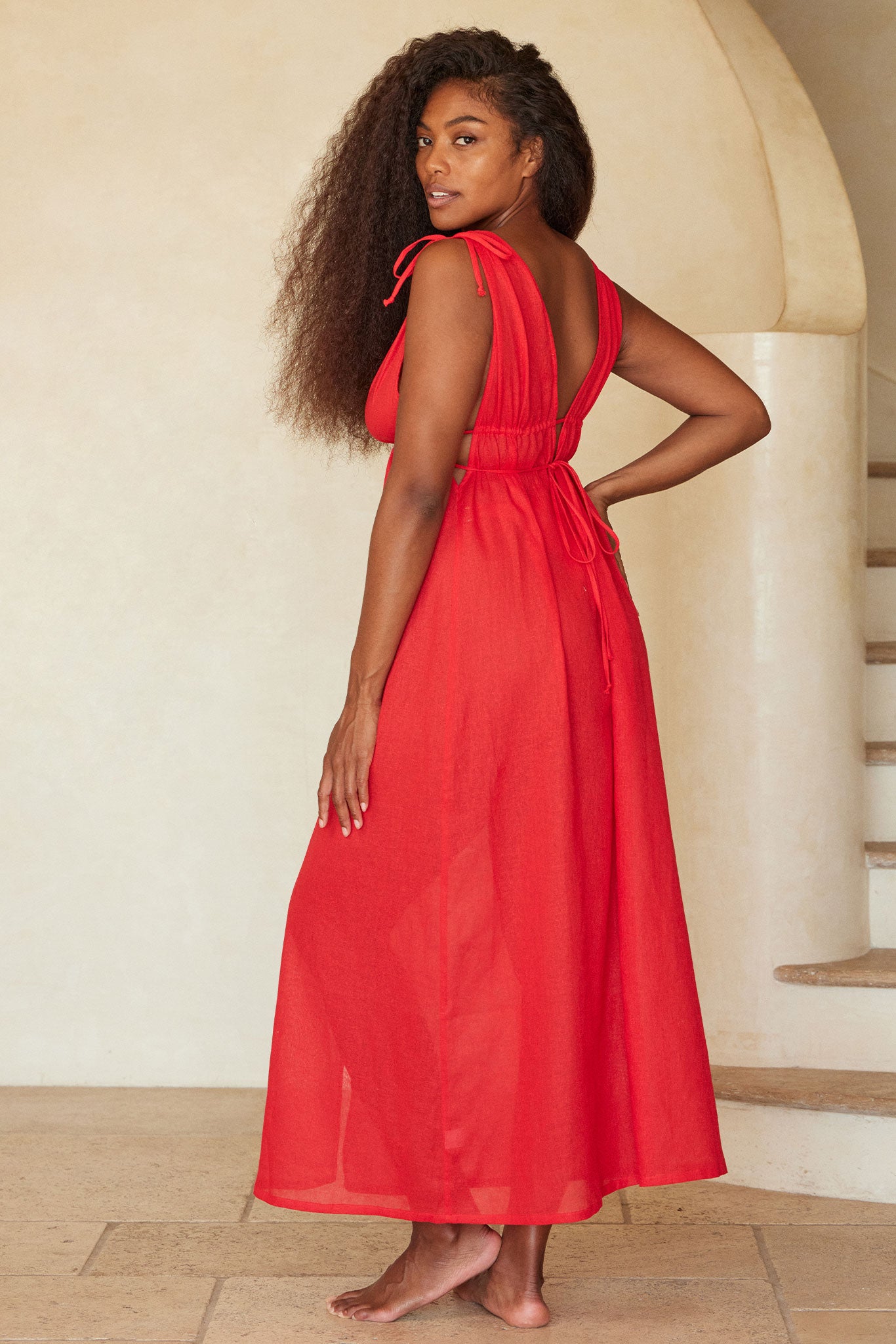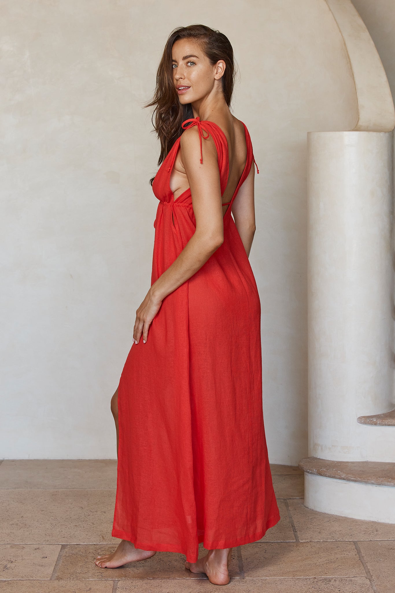Find your inner goddess in the Mallorca Dress. Offering a chic and elevated look, this maxi dress features cut out details, high slit details, a plunging neckline and wrap around tie detailing, perfect for a custom fit. Pair with any accessory for a beach-to-bar look.
