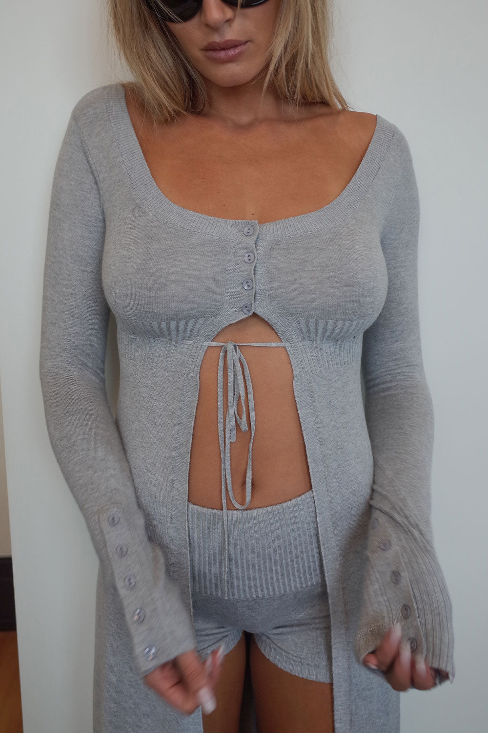 Made with super soft, fine knit fabric, the Jewel cardigan features buttons on the cuffs and bust, a tie detail, and a midi length fit. This cozy layer can be worn for warmer outdoor weather, or as the perfect piece for indoor lounging. Whichever way you decide to style, it's as cozy and comfortable as cardigans get.