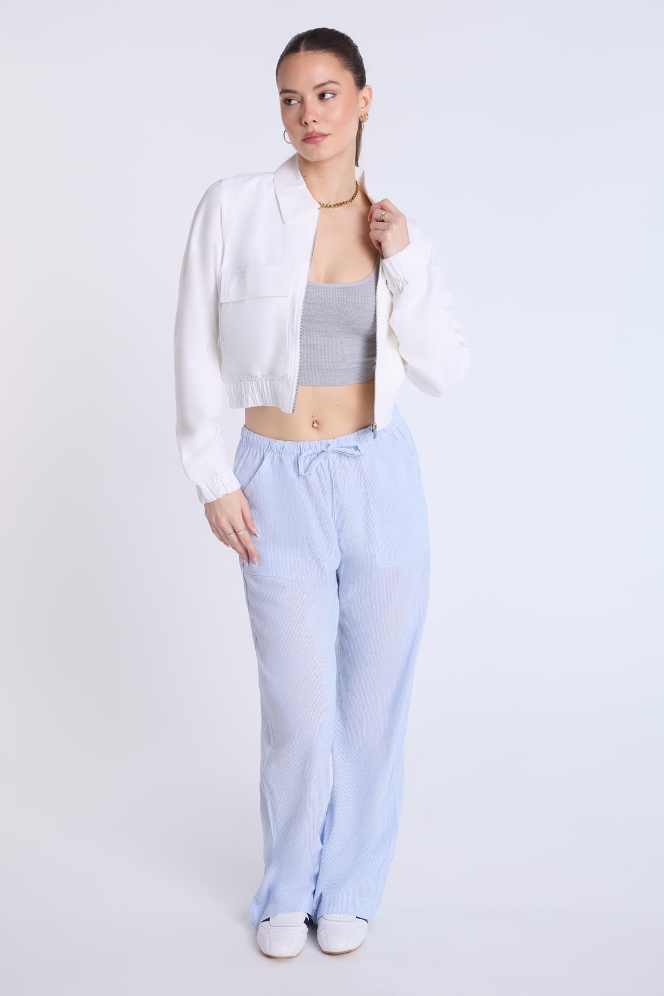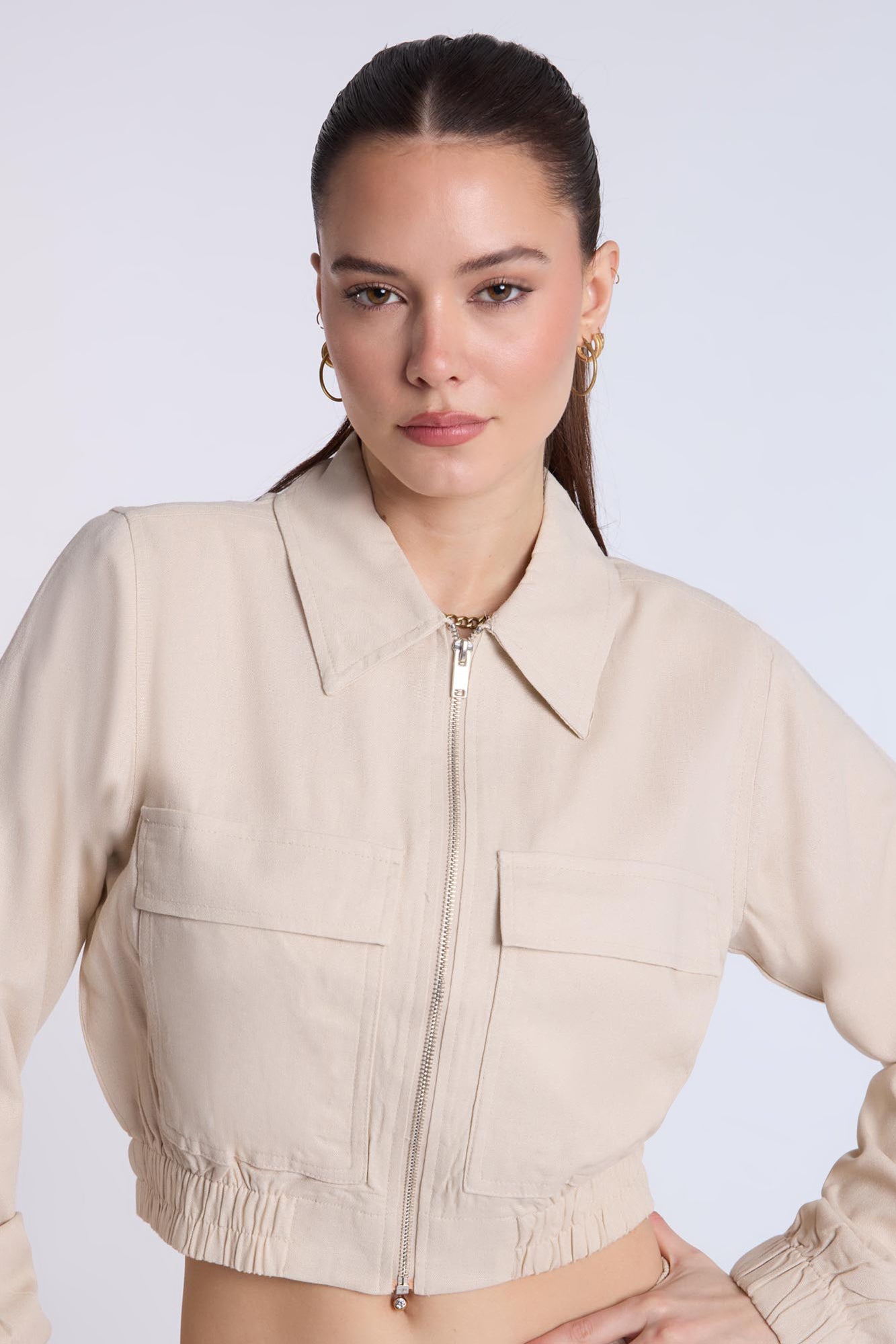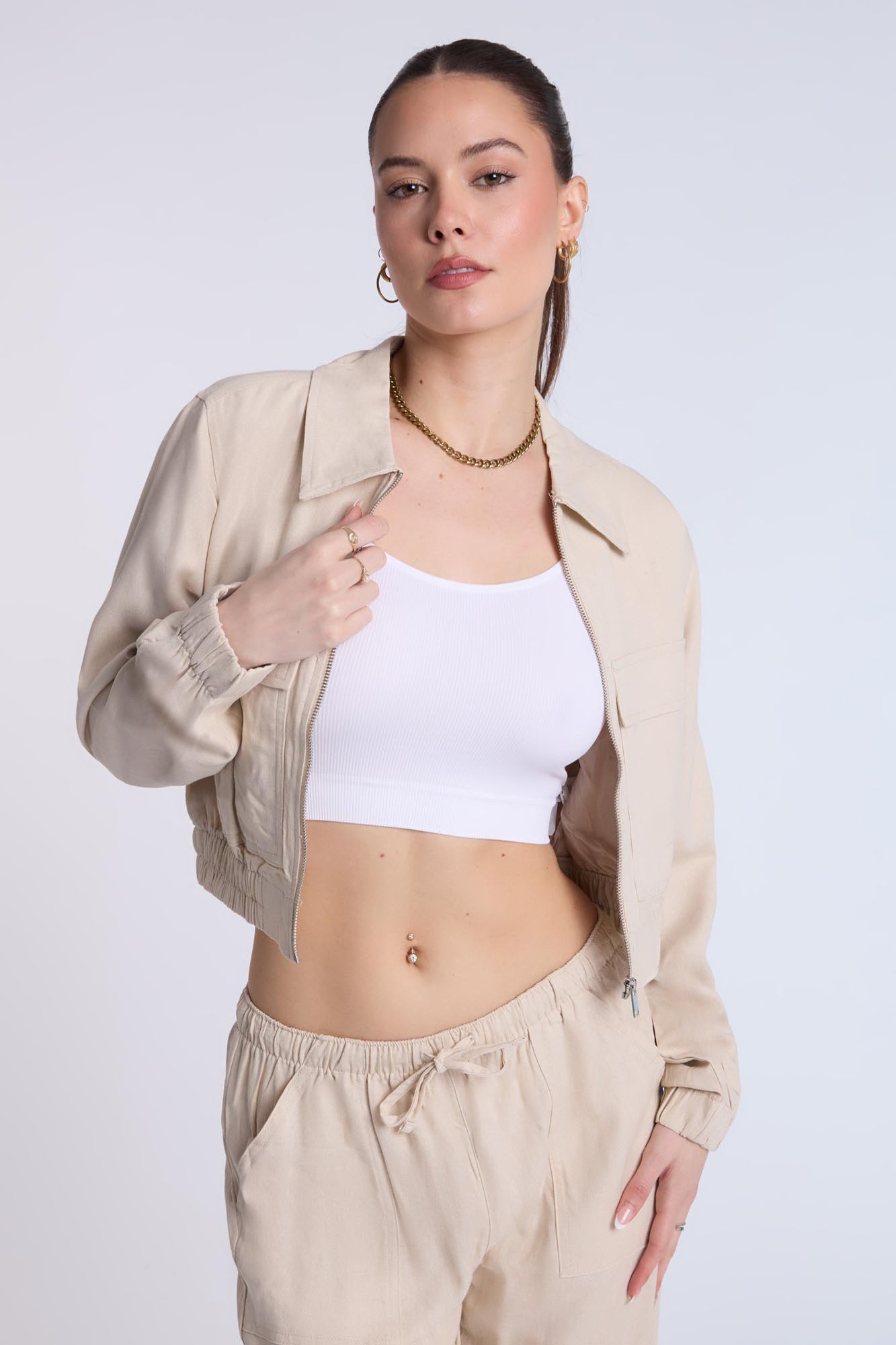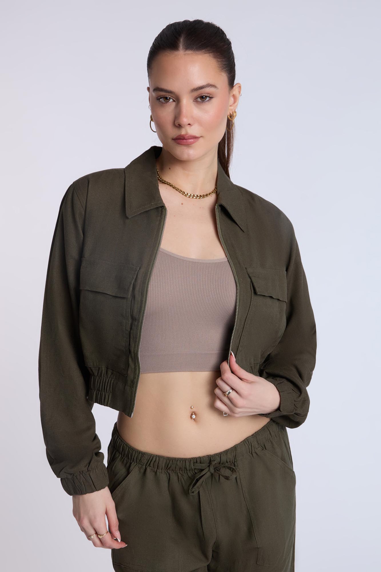 Woven outerwear. Linen-blend fabric. Breathable. Lightweight. Available in multiple solid colours. Relaxed bomber jacket with a zipped-front. Cargo pockets.