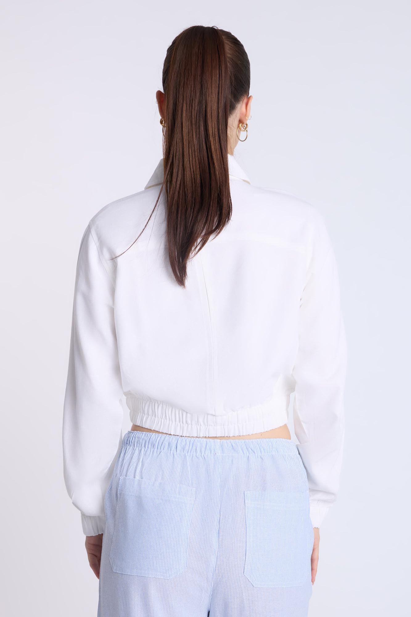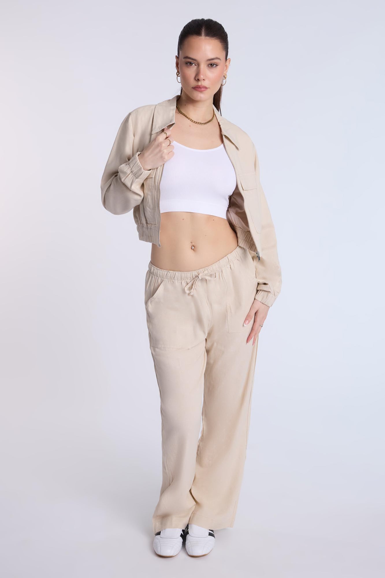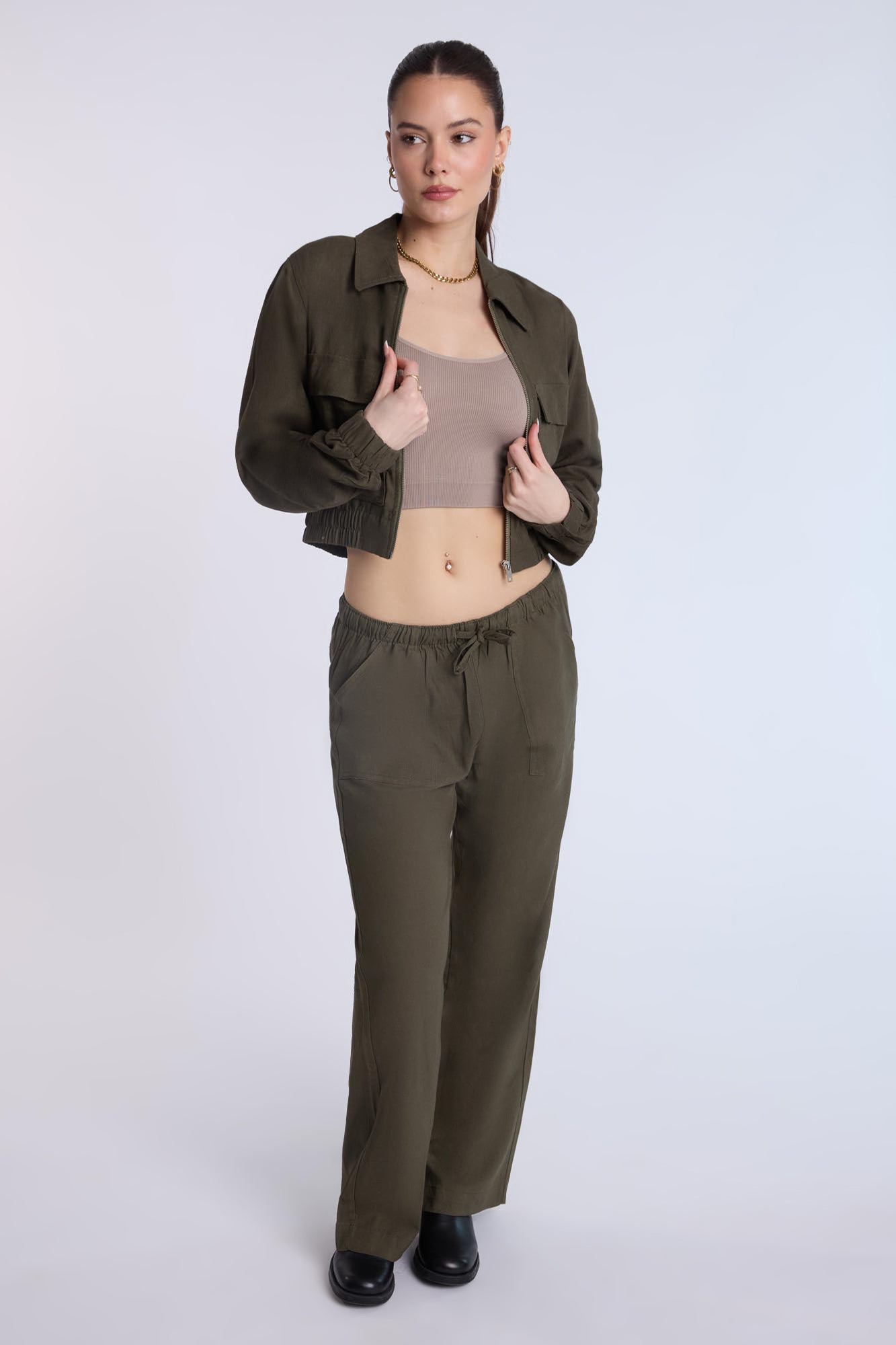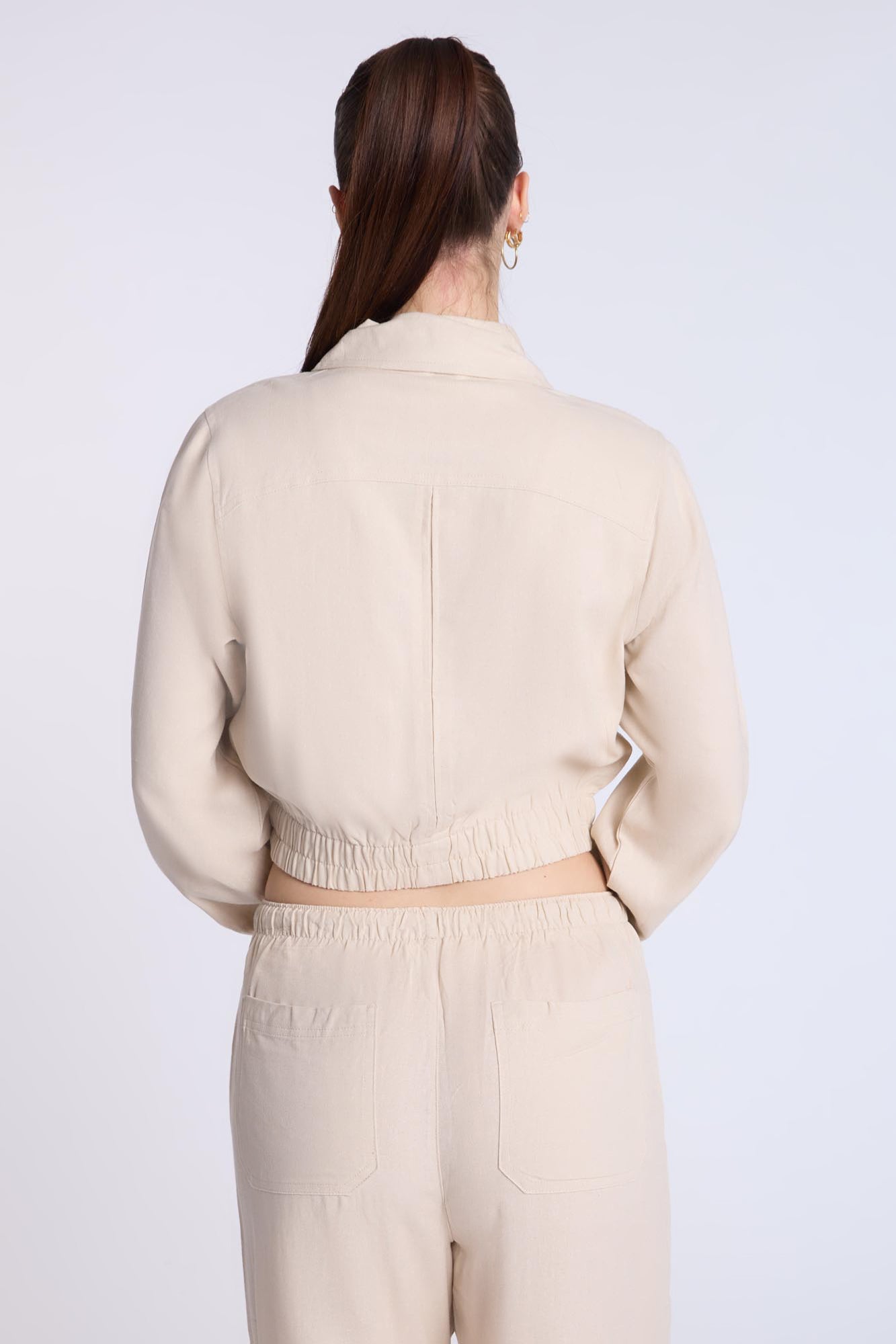 Woven outerwear. Linen-blend fabric. Breathable. Lightweight. Available in multiple solid colours. Relaxed bomber jacket with a zipped-front. Cargo pockets.
