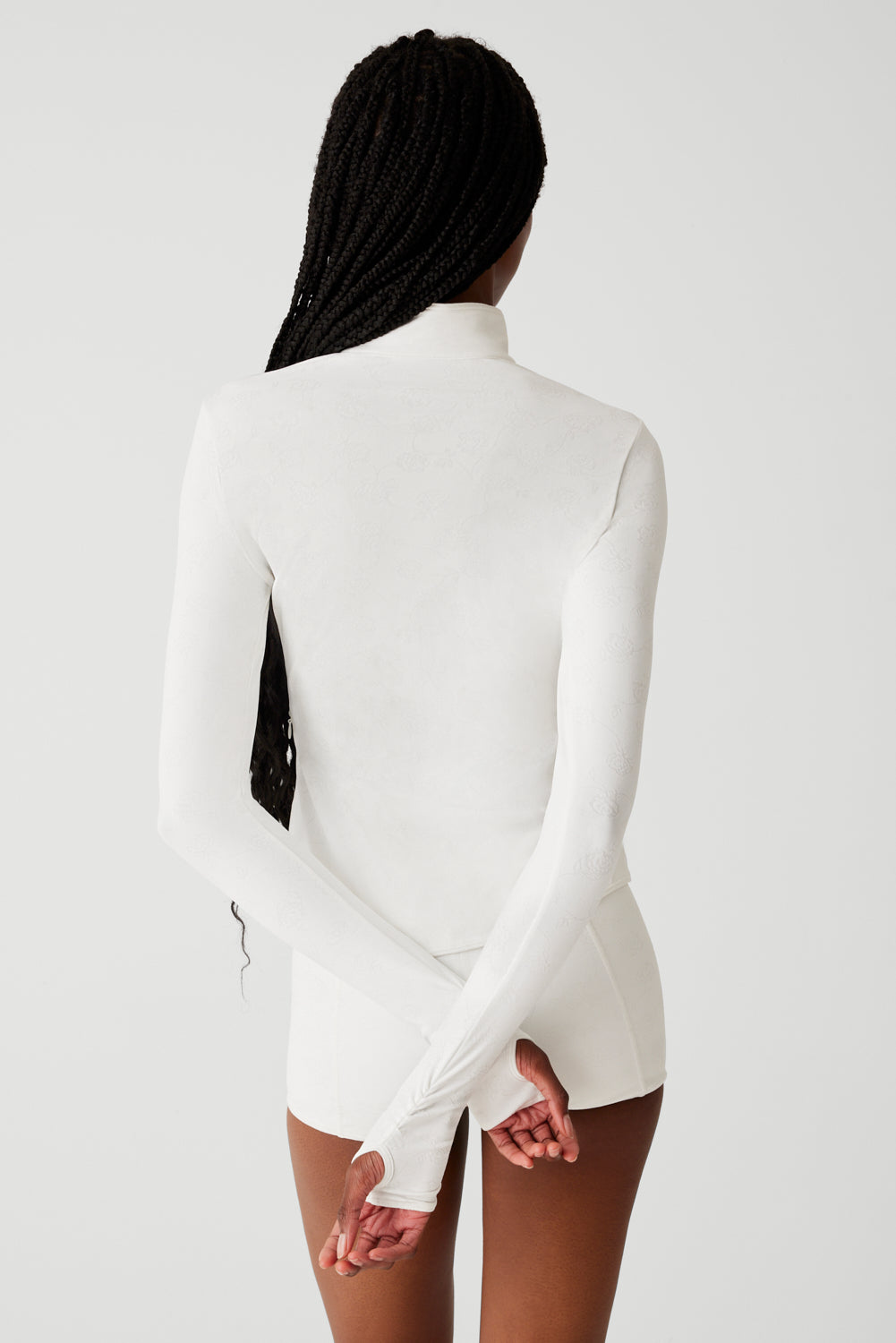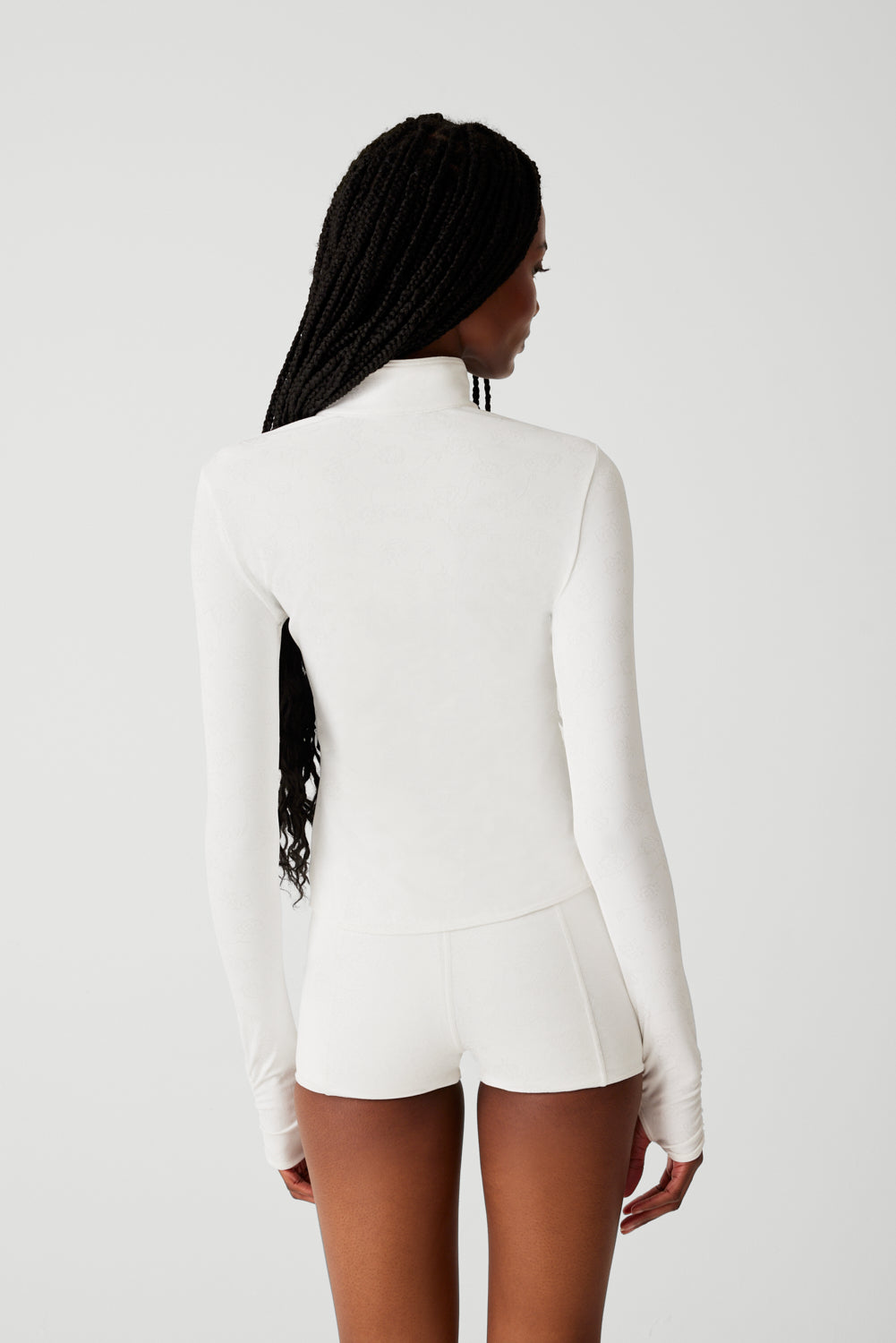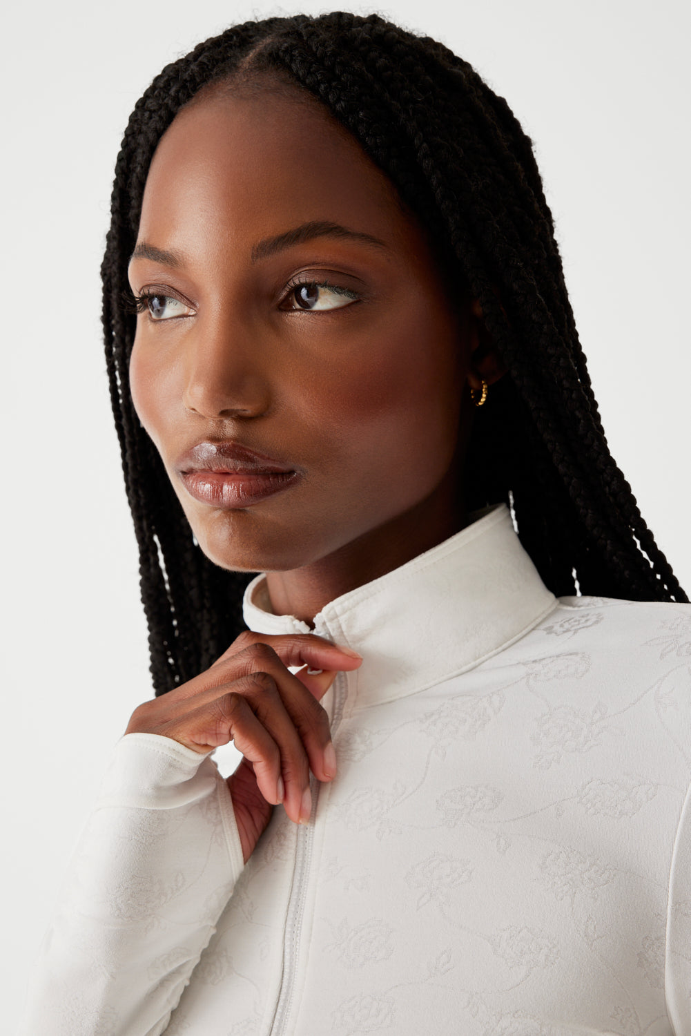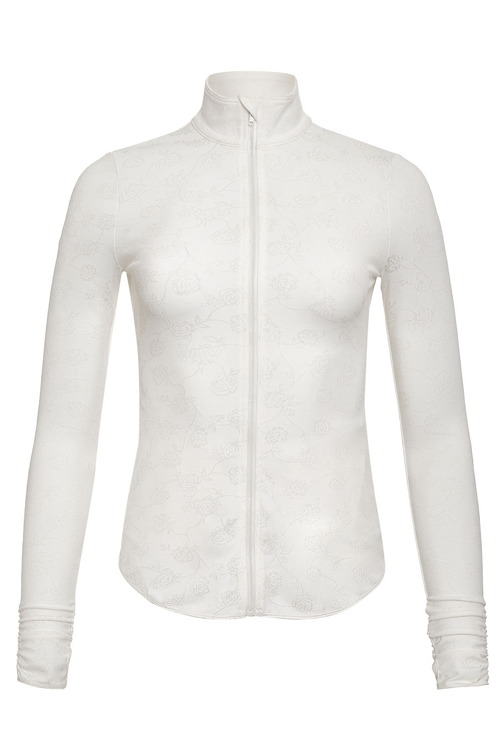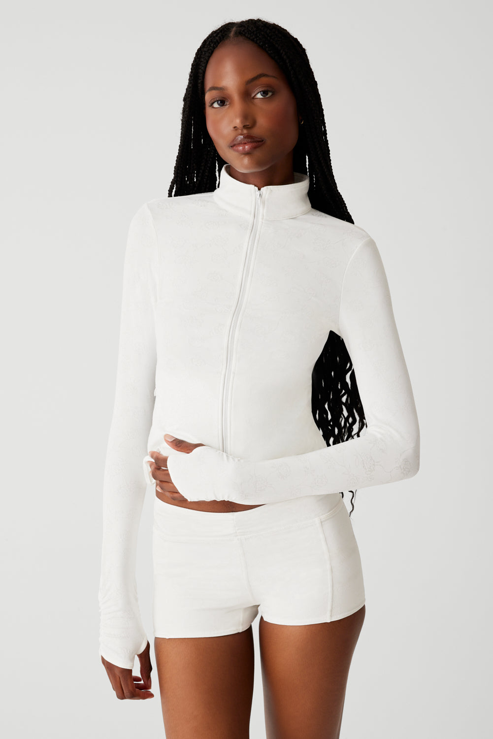 Look forward to cooler days ahead in our Renee jacket. This zip up silhouette is designed with thumbhole cutouts, exaggerated long sleeves, and our custom rose jacquard fabric. Pair the Renee jacket with the brand new Clementine legging as your go-to, full body active set.