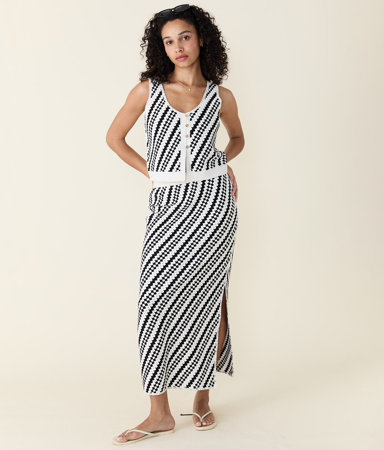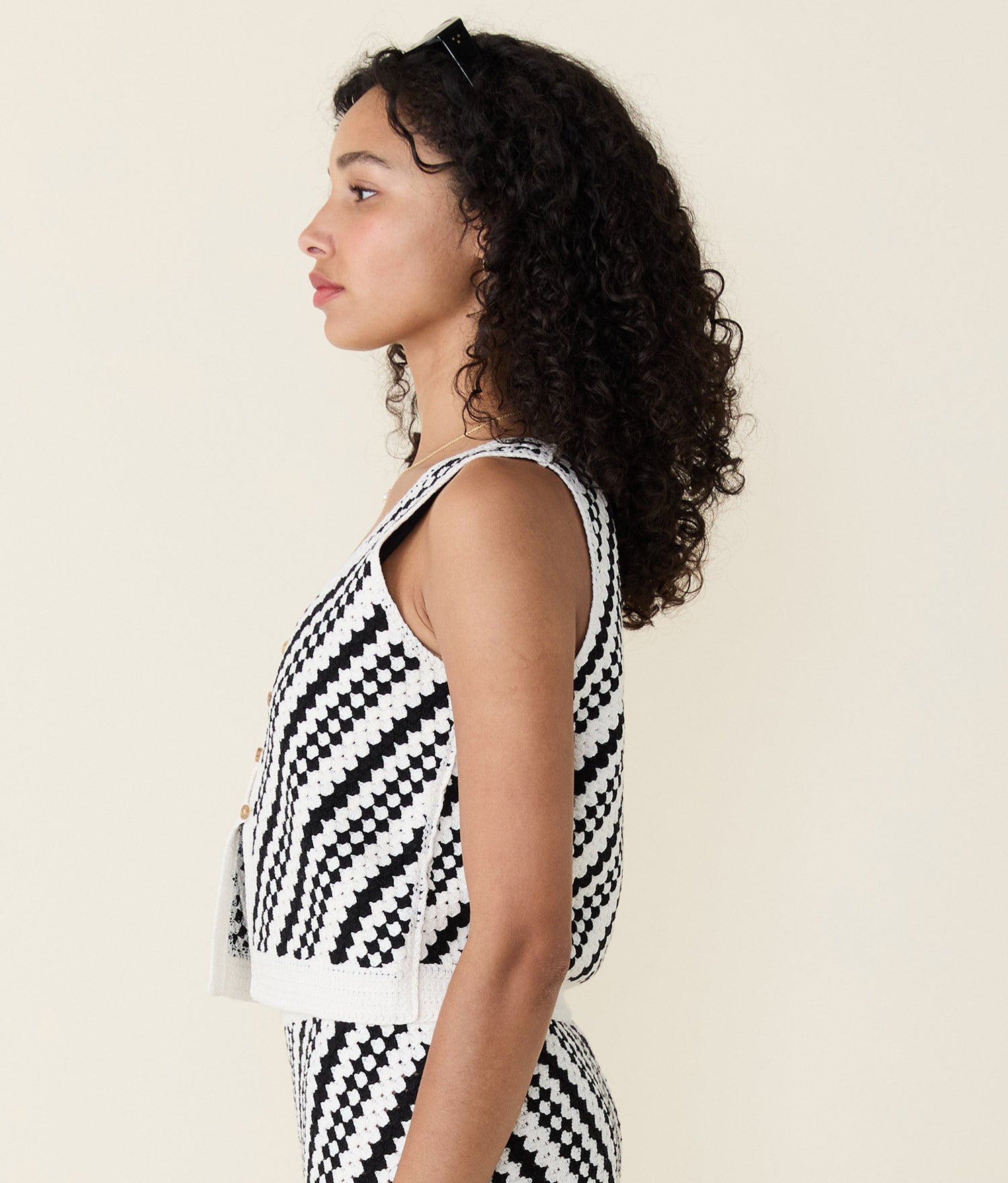 Your other tanks are gonna be jealous. This one has a flattering scoop neck, buttons all the way down, and hits right at the high hip — aka the perfect length for pairing with high-waisted anything (especially the matching skirt). Made with a diagonal crochet stitch that gives it texture and polish, without being fussy.