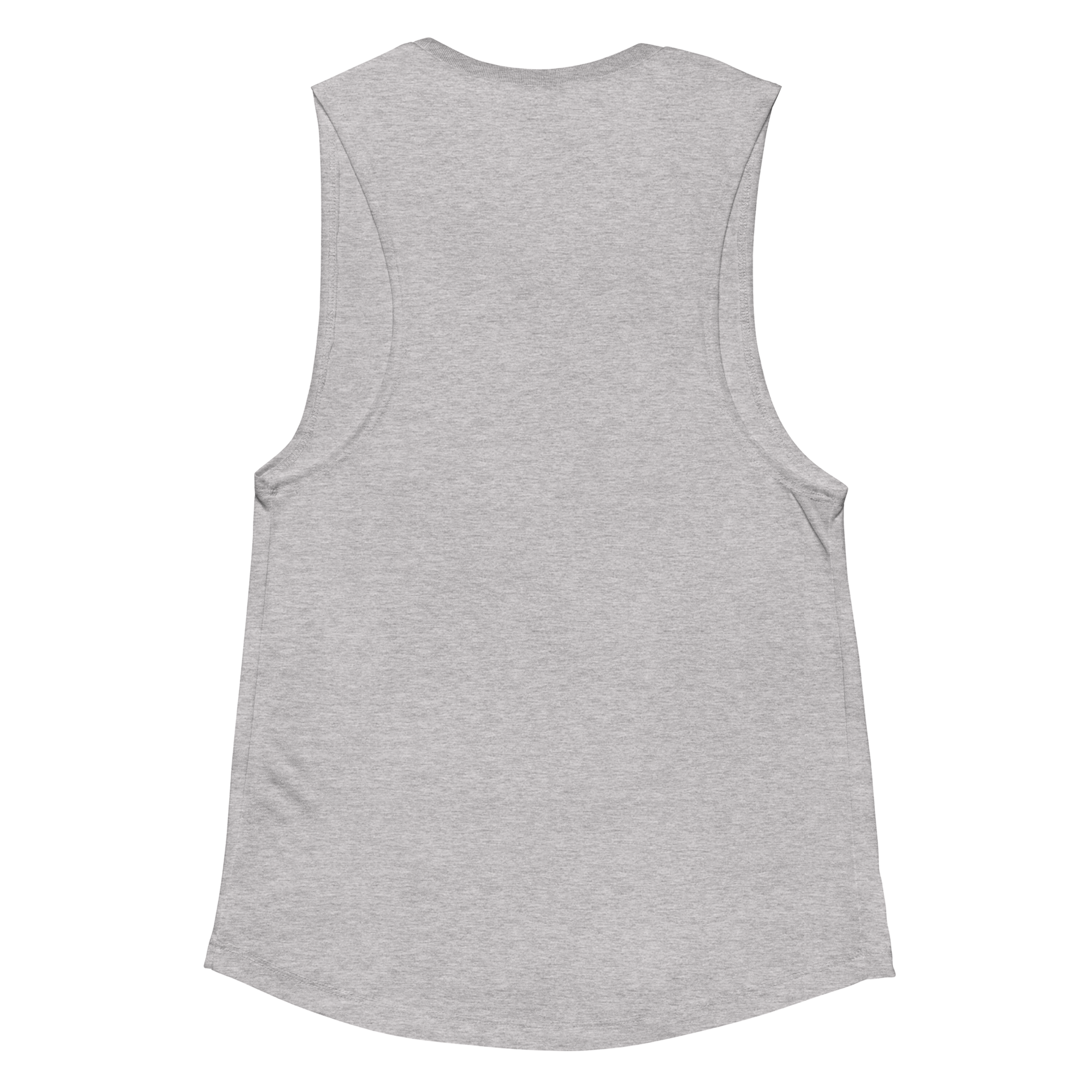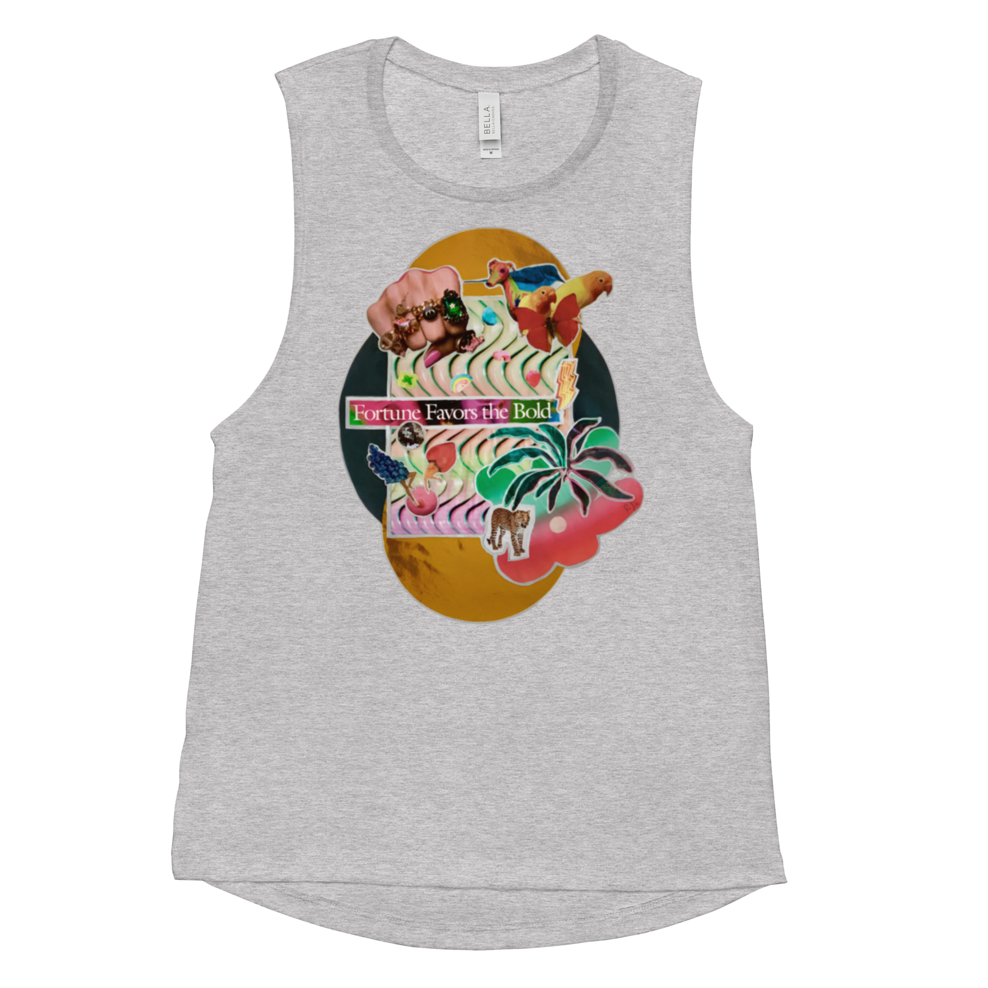 Heather grey muscle tank top with original handmade collage artwork with vibrant colors, abstract creatures, and small 'fortune favors the bold' slogan text.