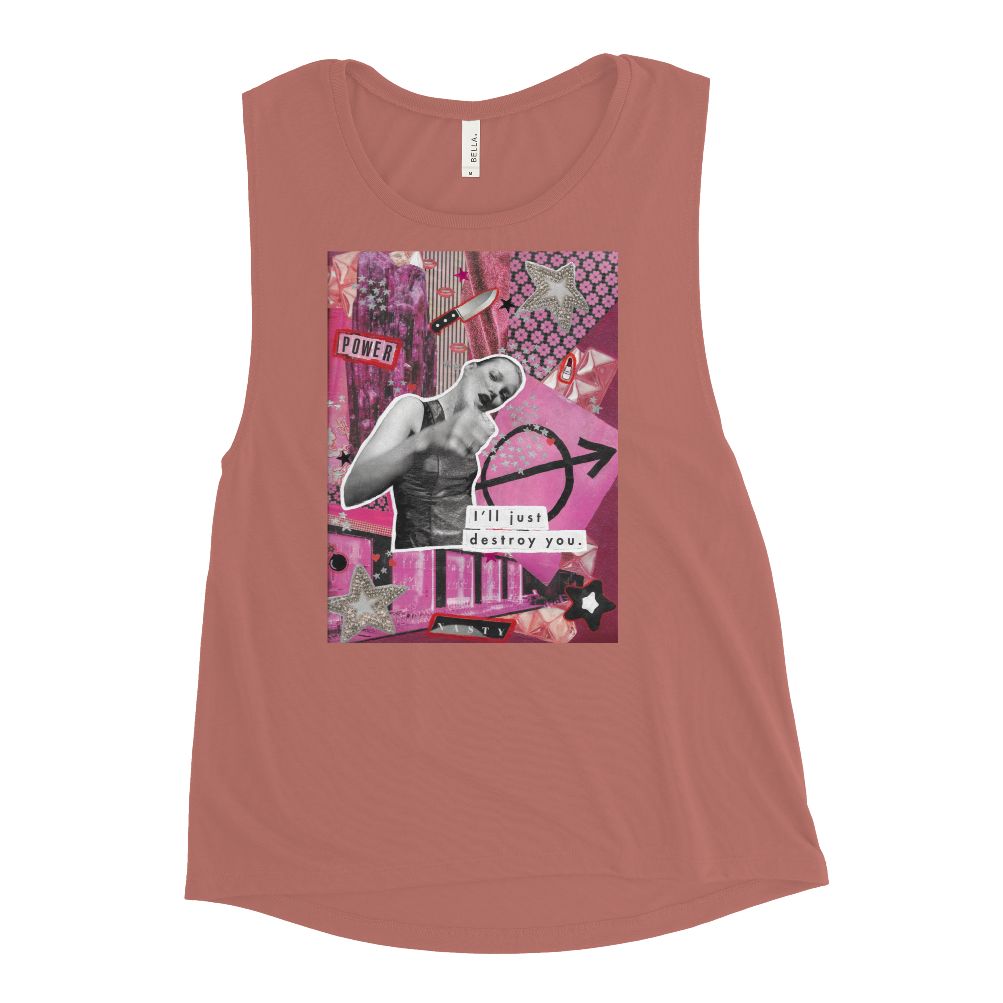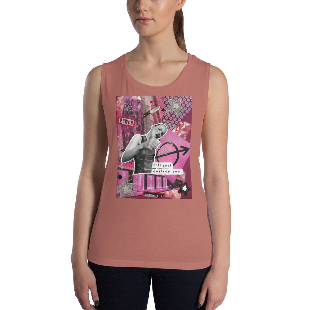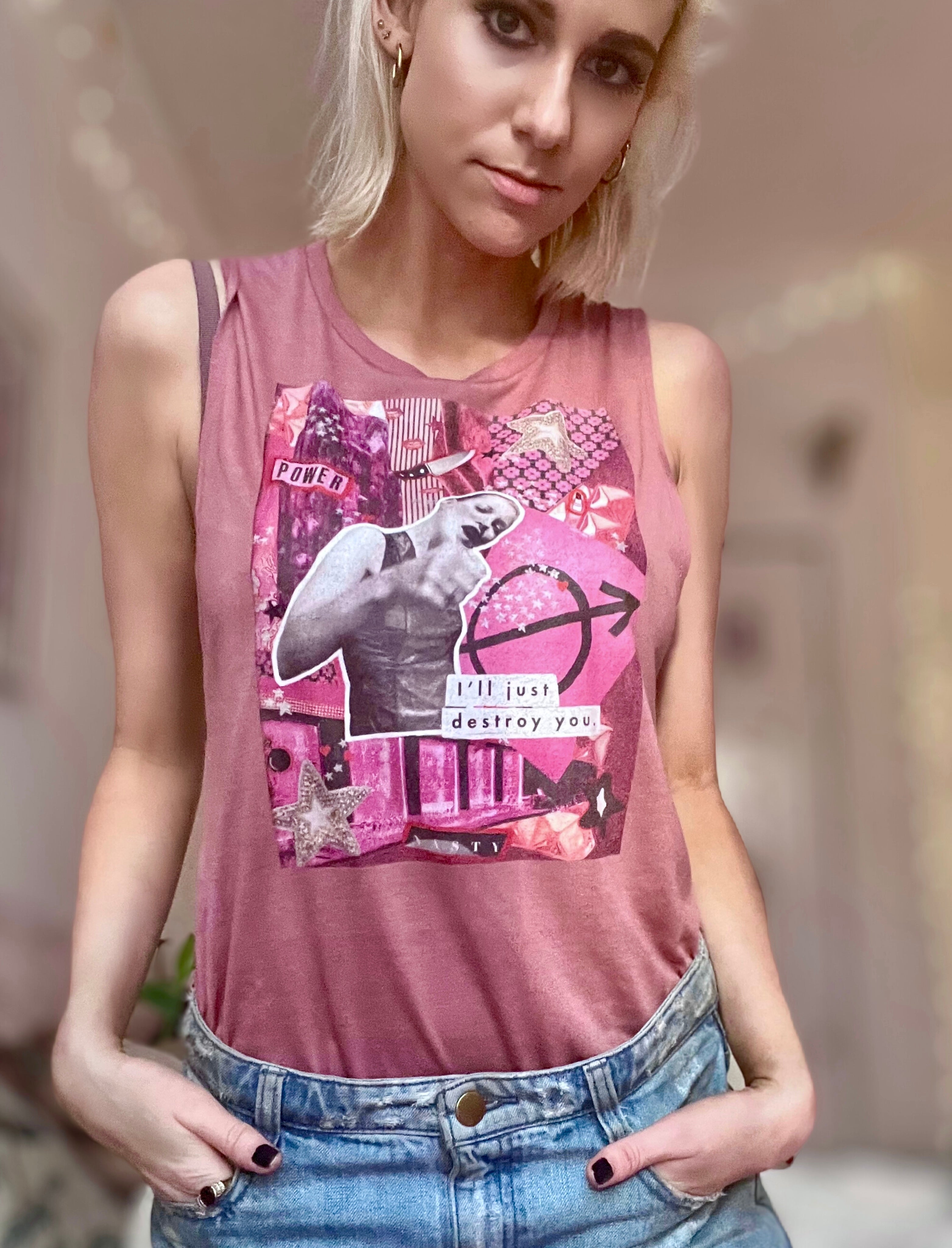Mauve muscle tank top with original handmade collage artwork, exclusive to maillot.co