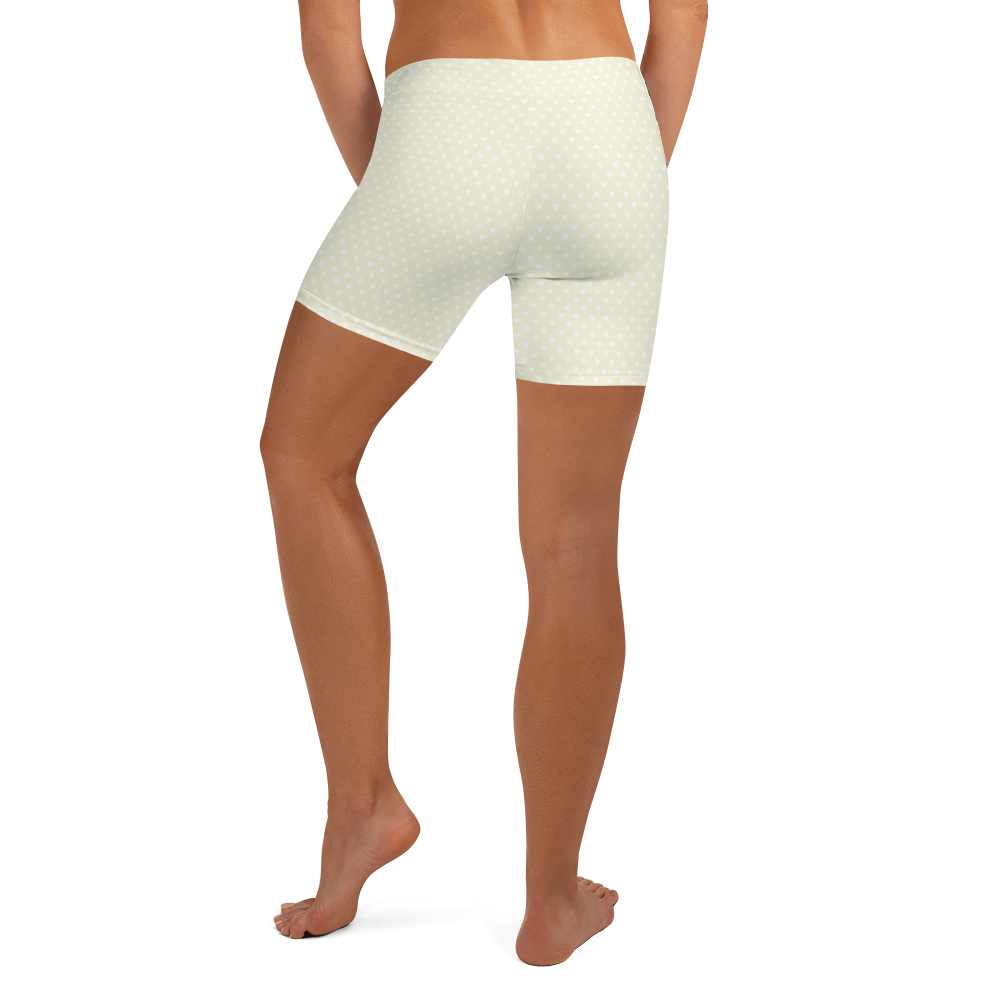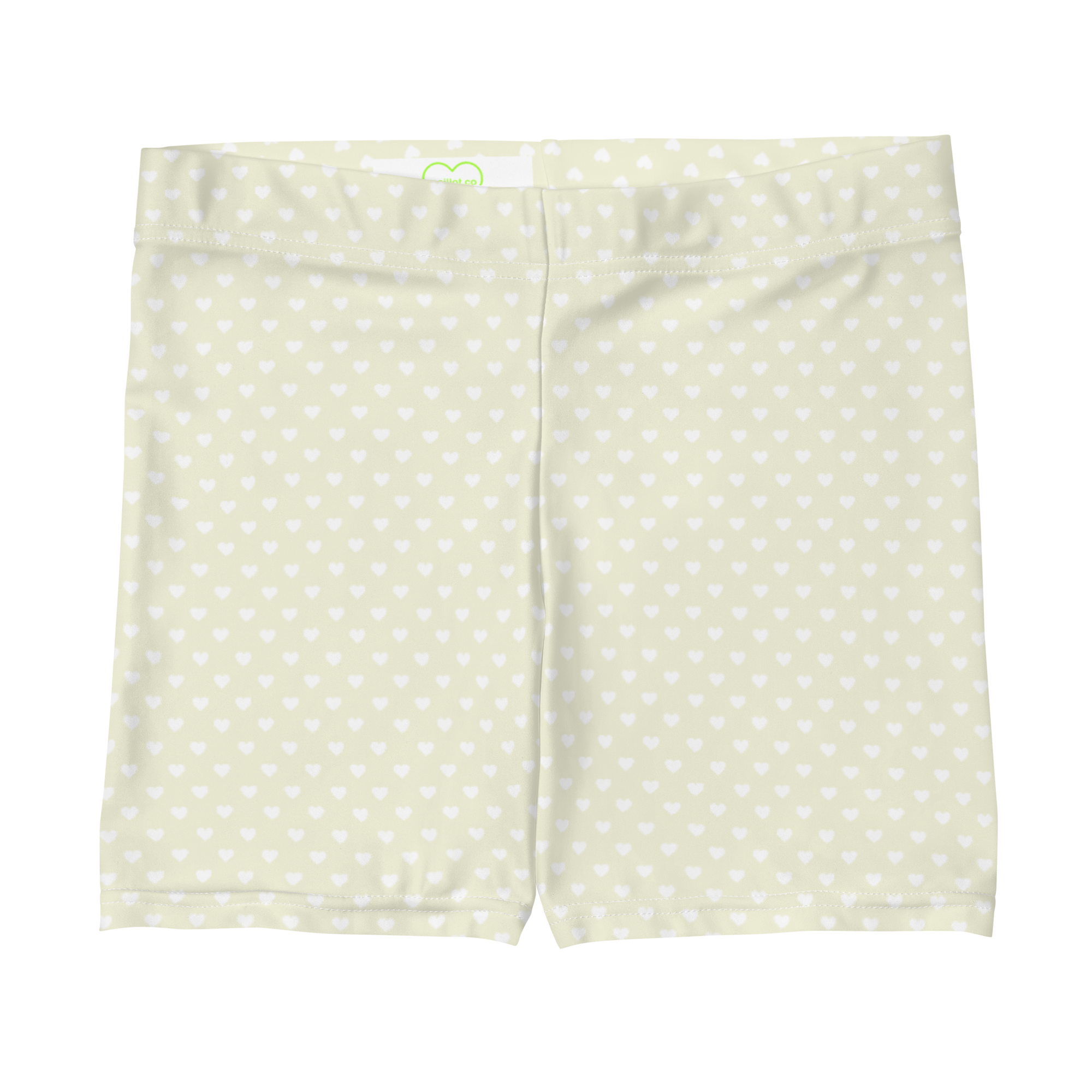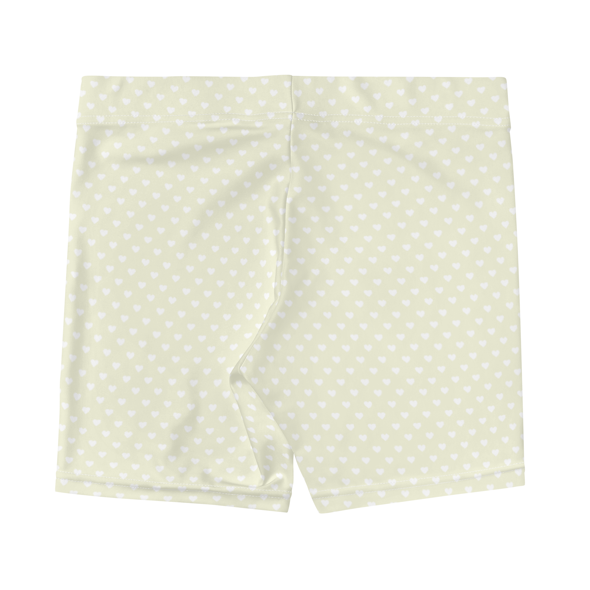 Neutral beige women’s biker shorts with white heart-shaped polka dot print.